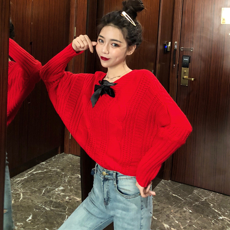 / chic前后兩穿綁帶蝴蝶結套頭毛衣女秋冬裝新款寬松蝙蝠長袖針織衫