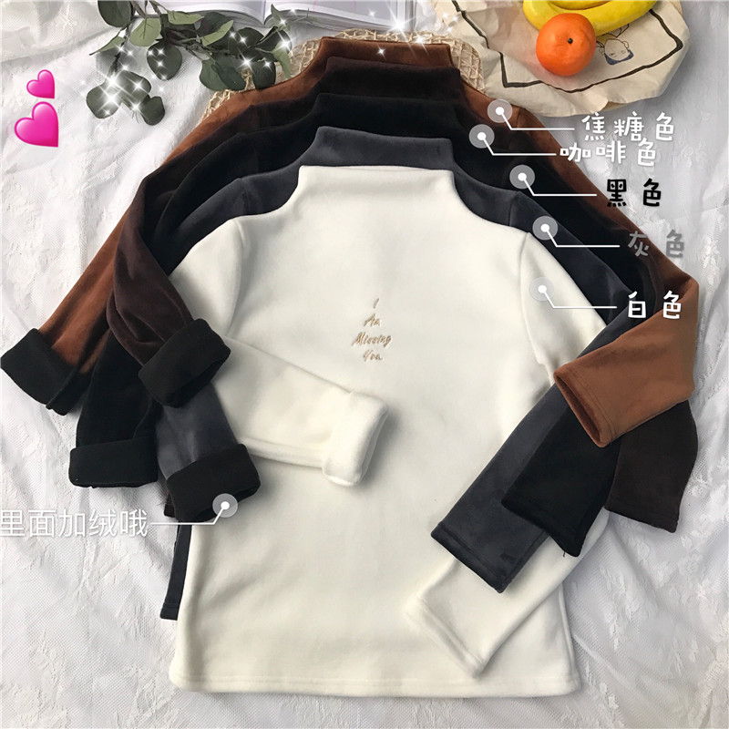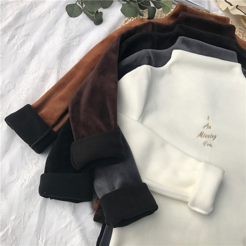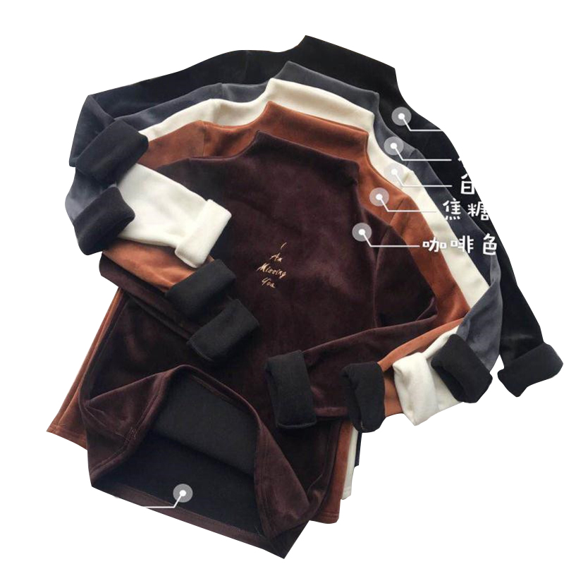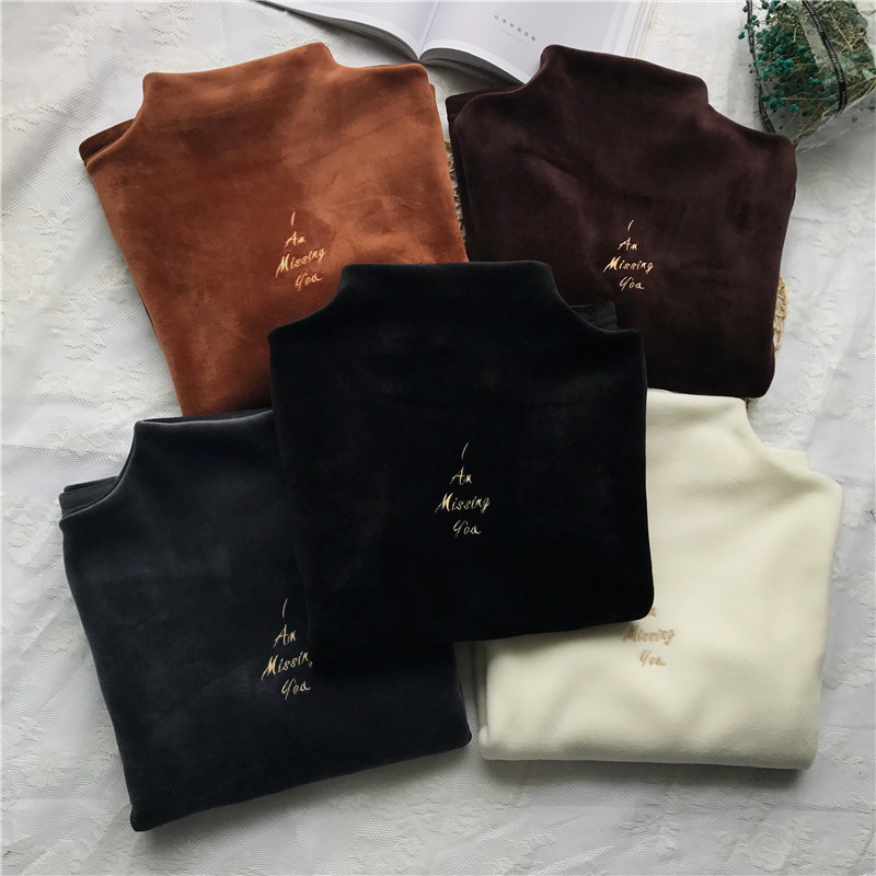 / 秋冬韓版絲絨字母刺繡高領長袖加絨加厚打底衫修身顯瘦T恤上衣女