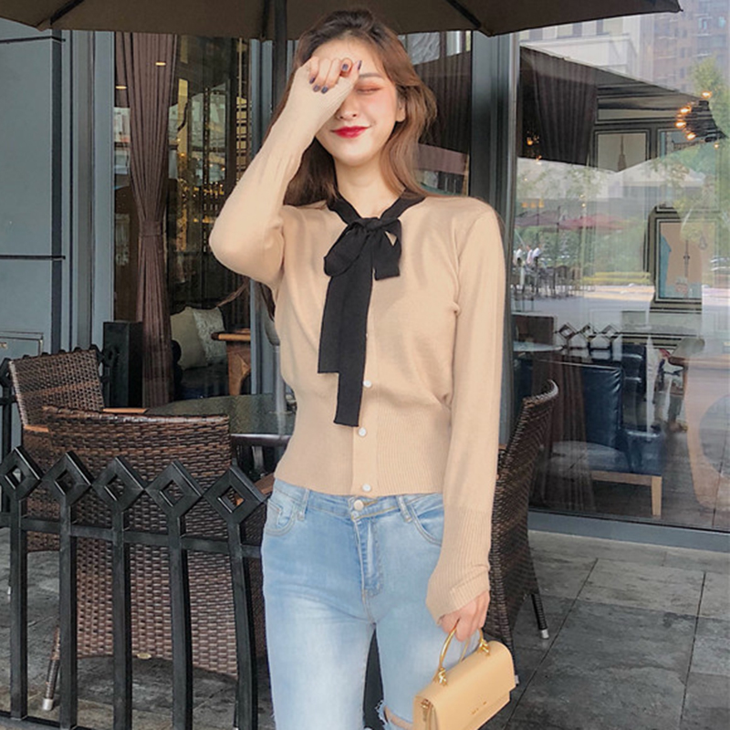 / 秋裝女2018新款學生收腰蝴蝶結開衫長袖短款針織外套高腰黑色上衣
