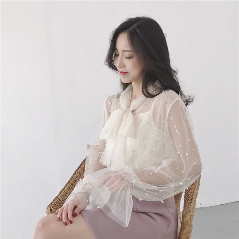 / 女士秋裝2018新款很仙的上衣網紗雪紡衫女襯衫背心蝴蝶結釘珠長袖
