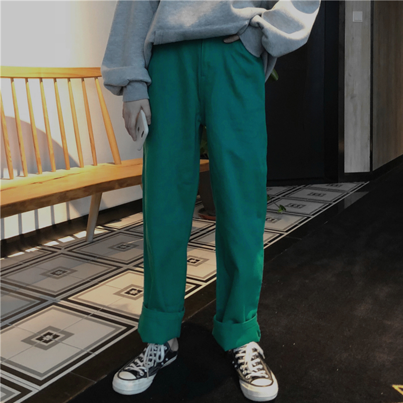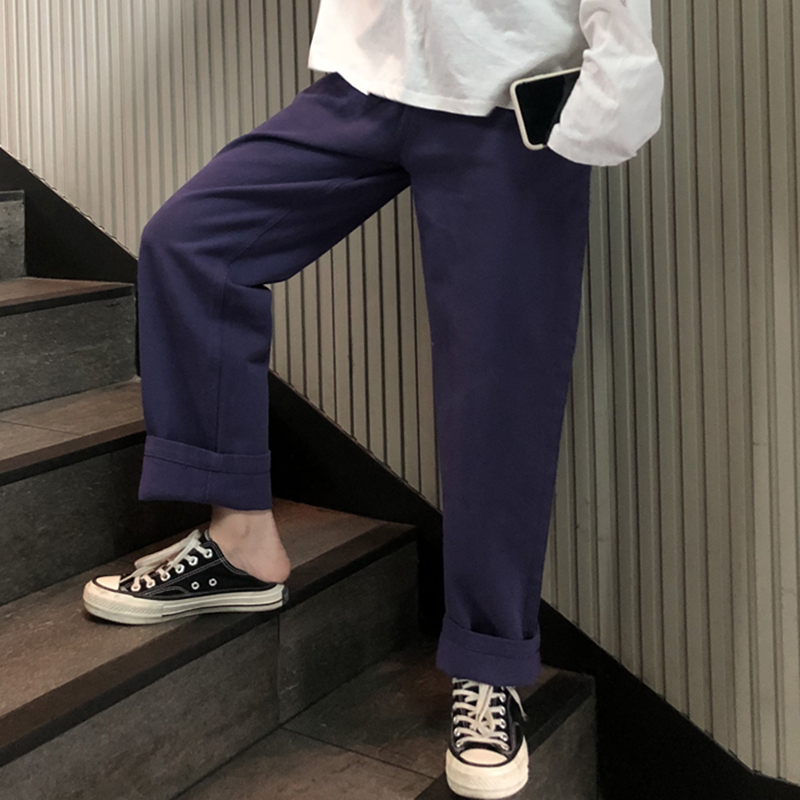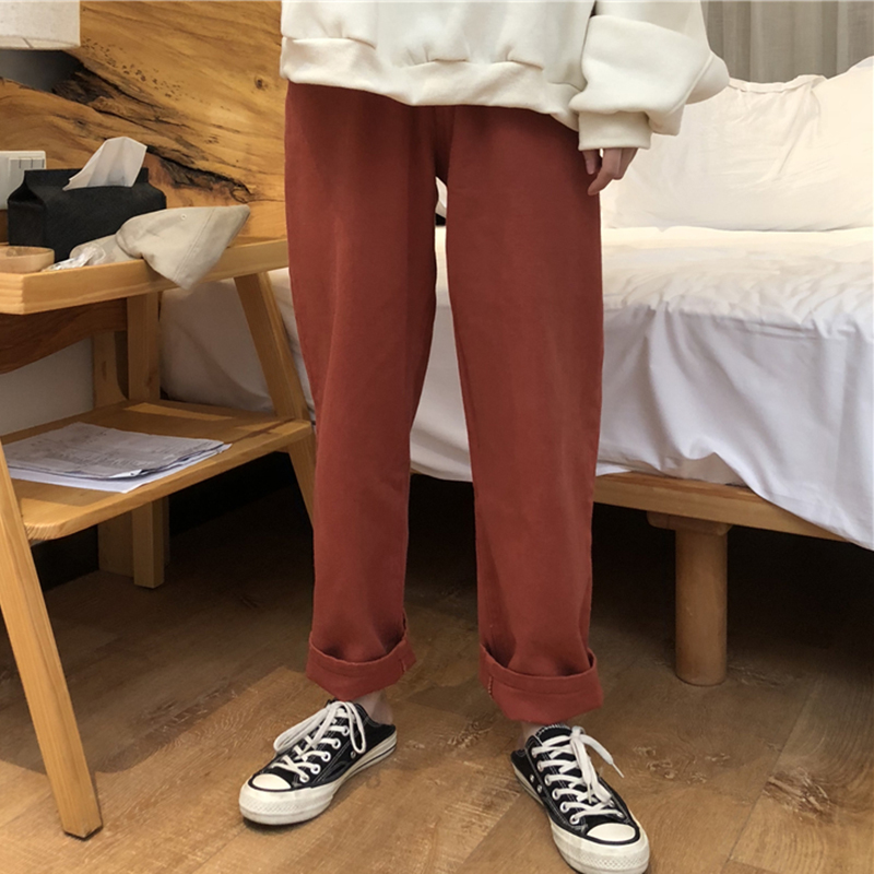 / 復古高腰顯瘦休閑褲子女秋冬裝新款韓版學生純色寬松直筒卷邊長褲