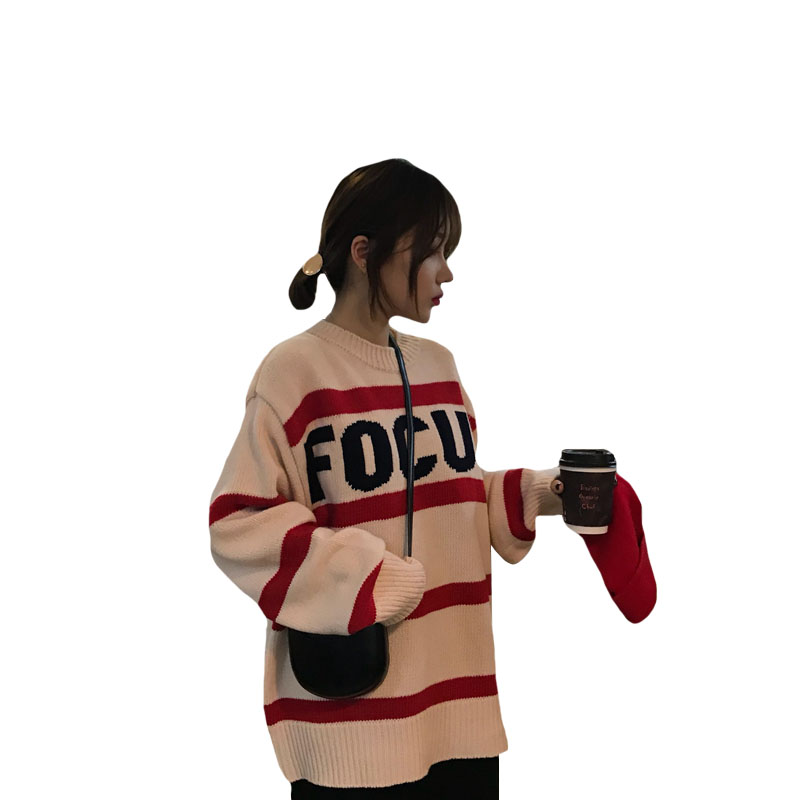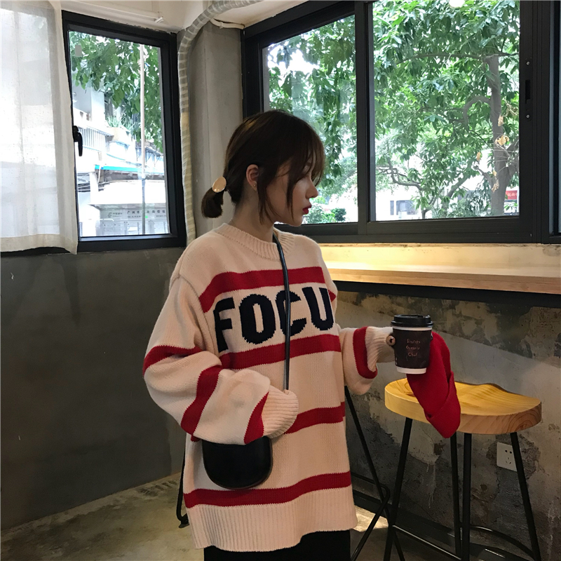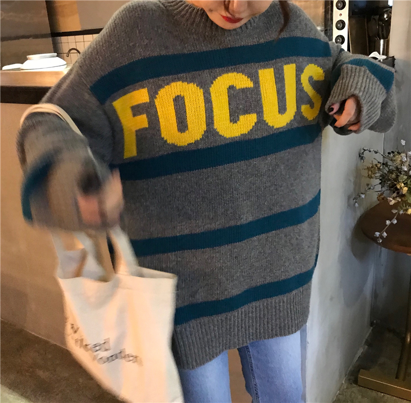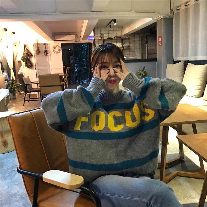 2018新款秋冬韓版中長款慵懶風字母寬松網紅套頭針織衫毛衣外套女