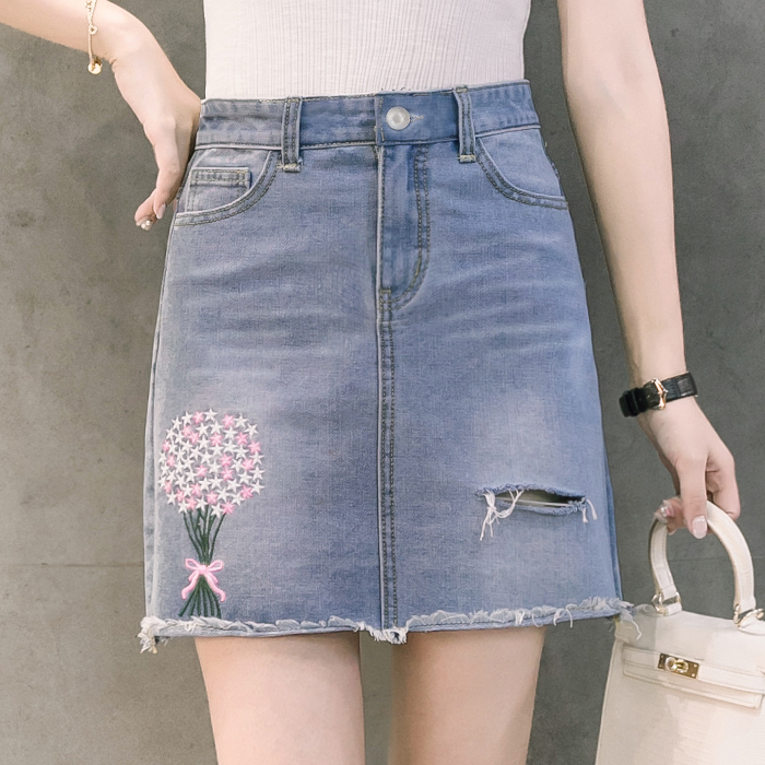 / 韓版高腰繡花牛仔裙半身裙女破洞短裙A字裙包臀毛邊半裙夏季