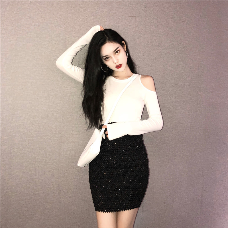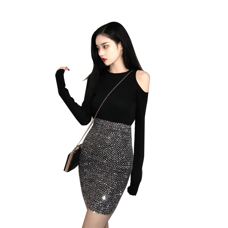韓國復古風秋裝女2018新款修身顯瘦露肩T恤+高腰針織包臀半身裙潮