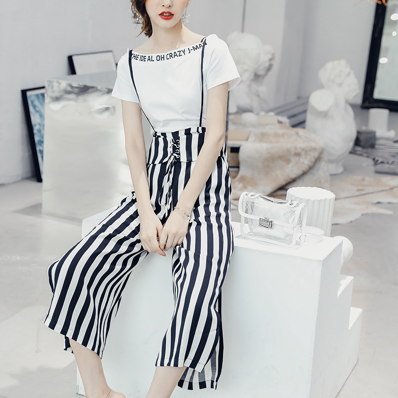 背帶連體闊腿褲女夏季新款韓版七分褲高腰白色T恤條紋垂感兩件套