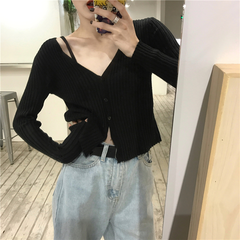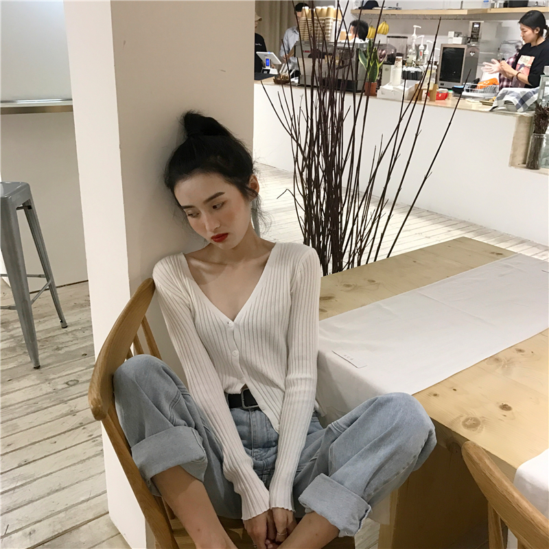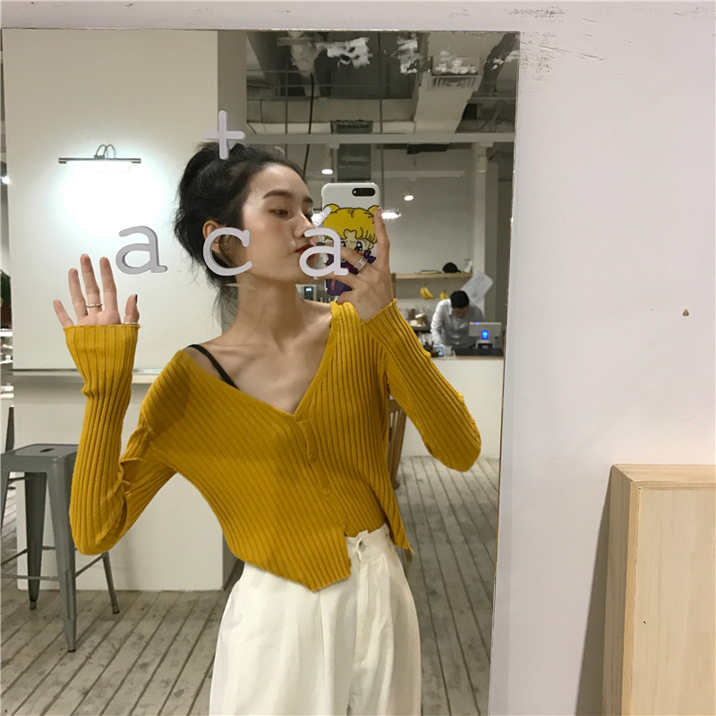 / 秋裝女2018新款慵懶V領純色韓版顯瘦坑條針織長袖短款毛衣小開衫