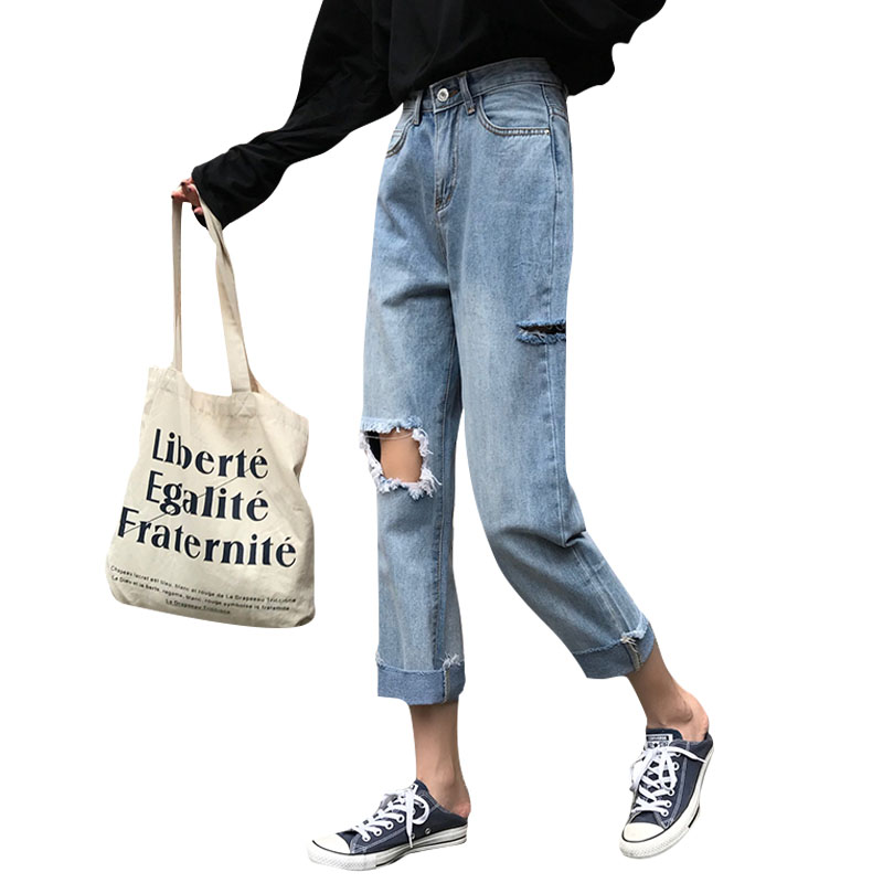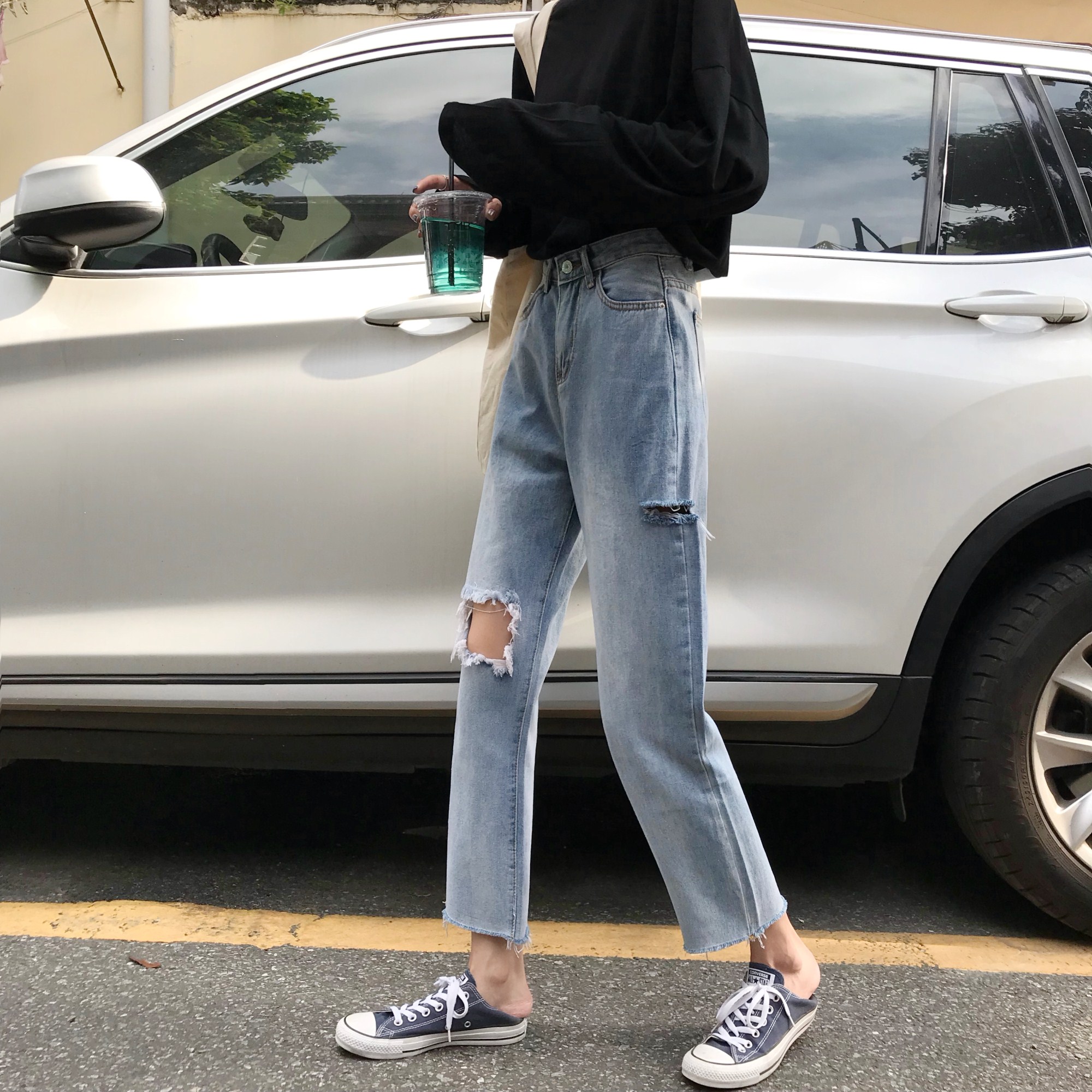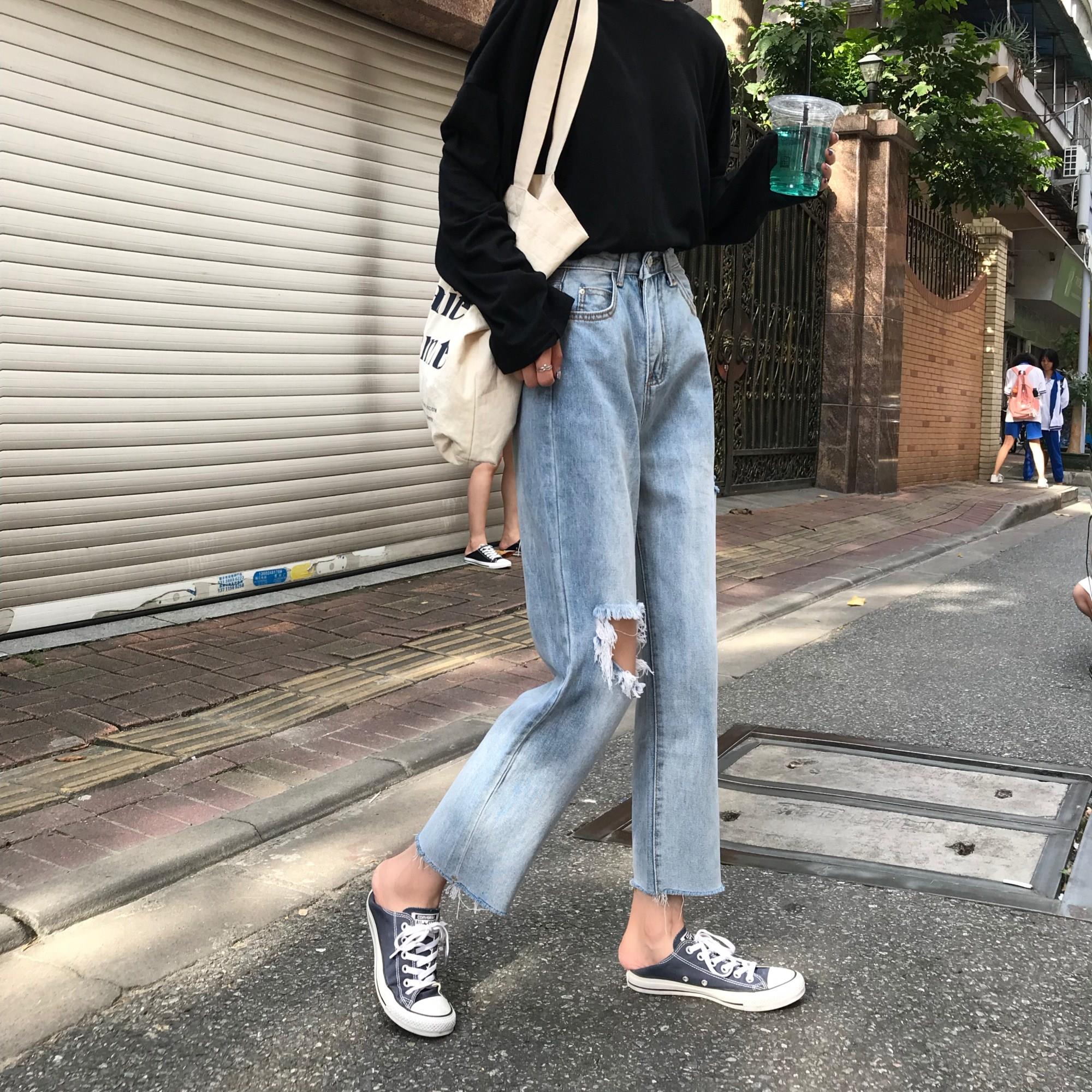 / 秋裝女裝韓版寬松水洗破洞顯瘦卷邊牛仔褲高腰闊腿褲直筒褲九分褲