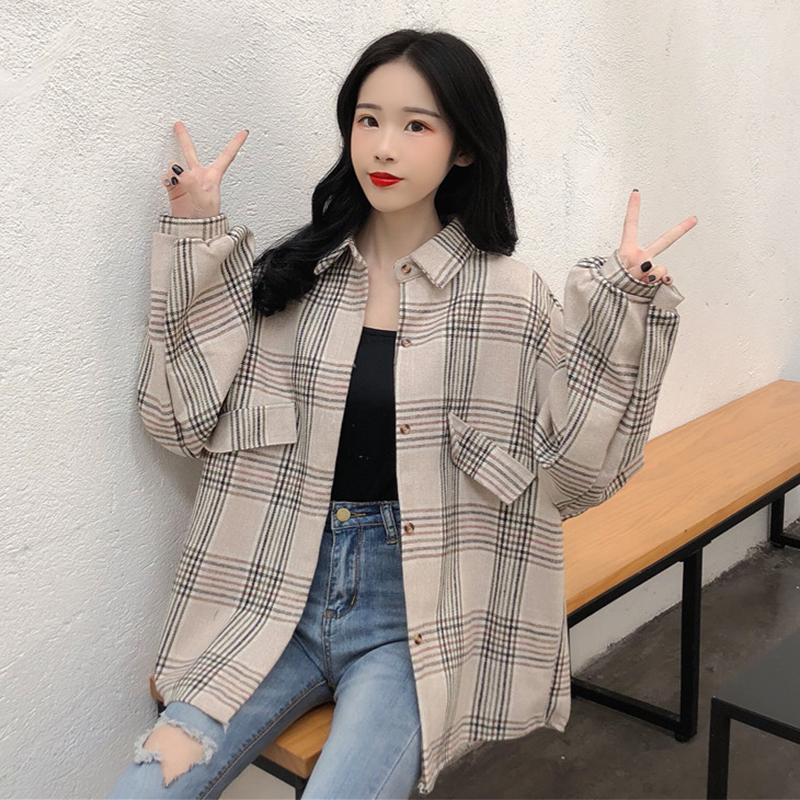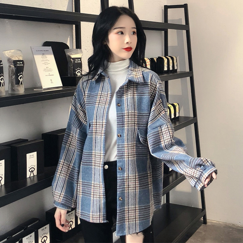 復古格子翻領襯衫女冬裝2018新款韓版中長款寬松燈籠長袖上衣外套