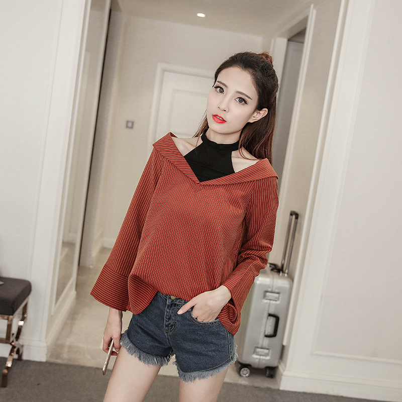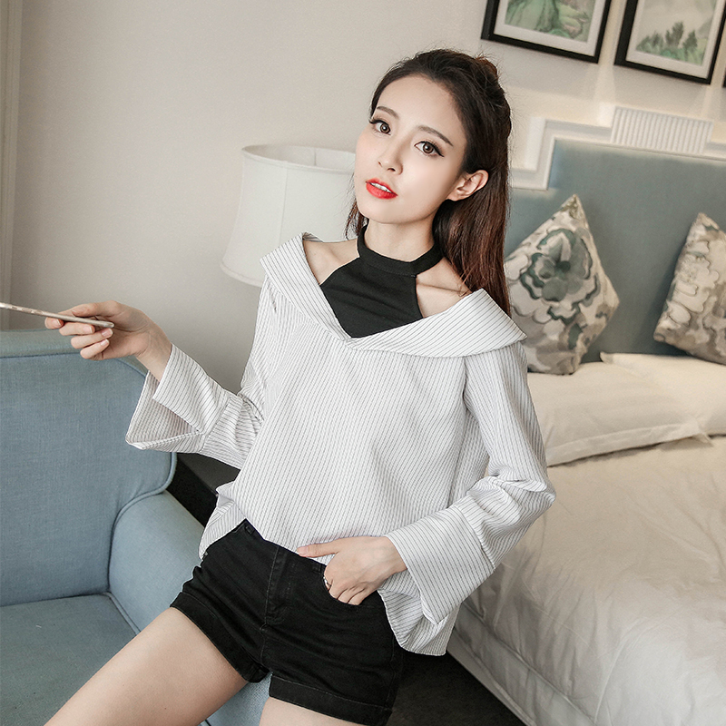 春秋新款女裝韓范假兩件襯衫寬松百搭長袖襯衣條紋露肩上衣潮
