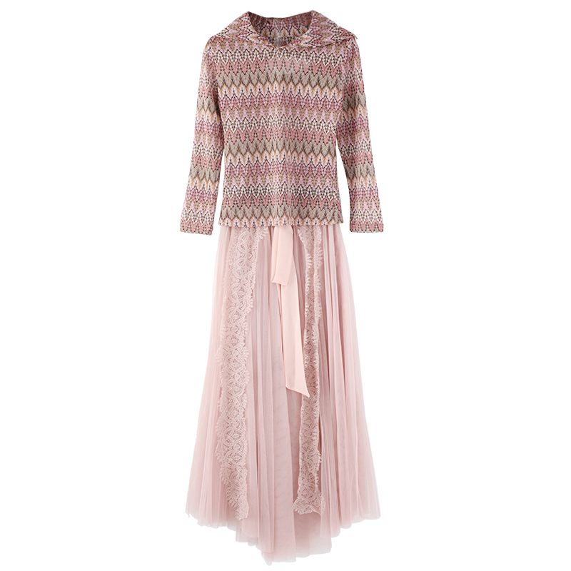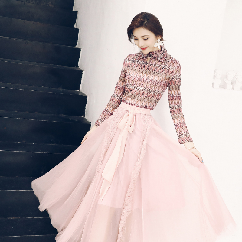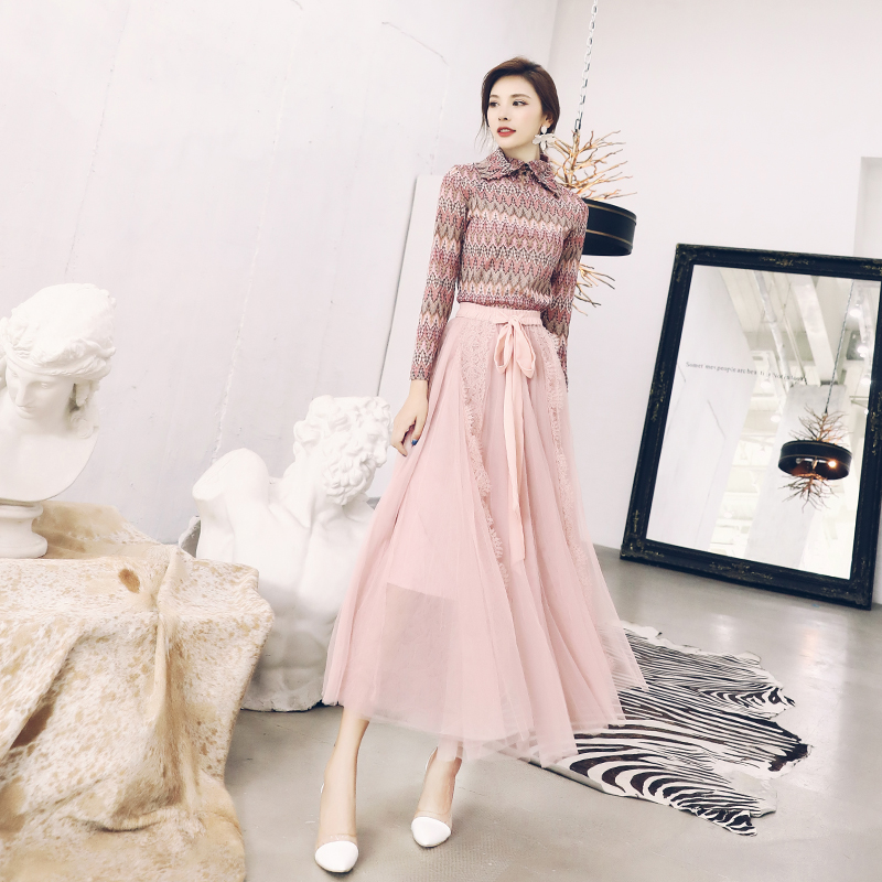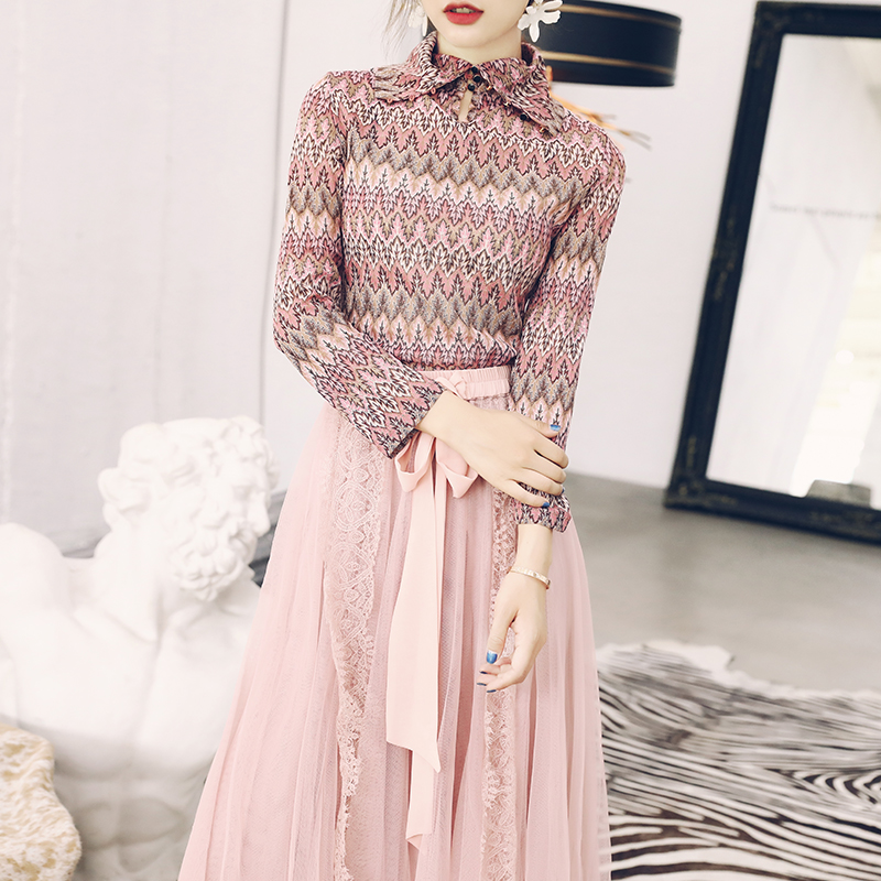 / 名媛氣質套裝女秋女神范復古港味長袖上衣蕾絲網紗拼接長裙子潮