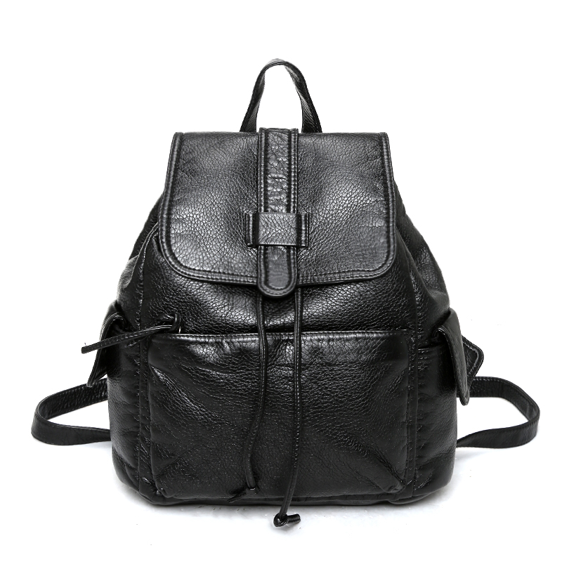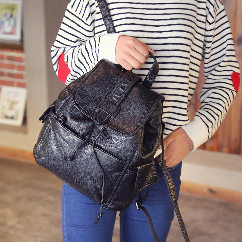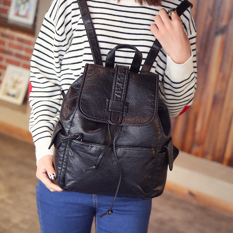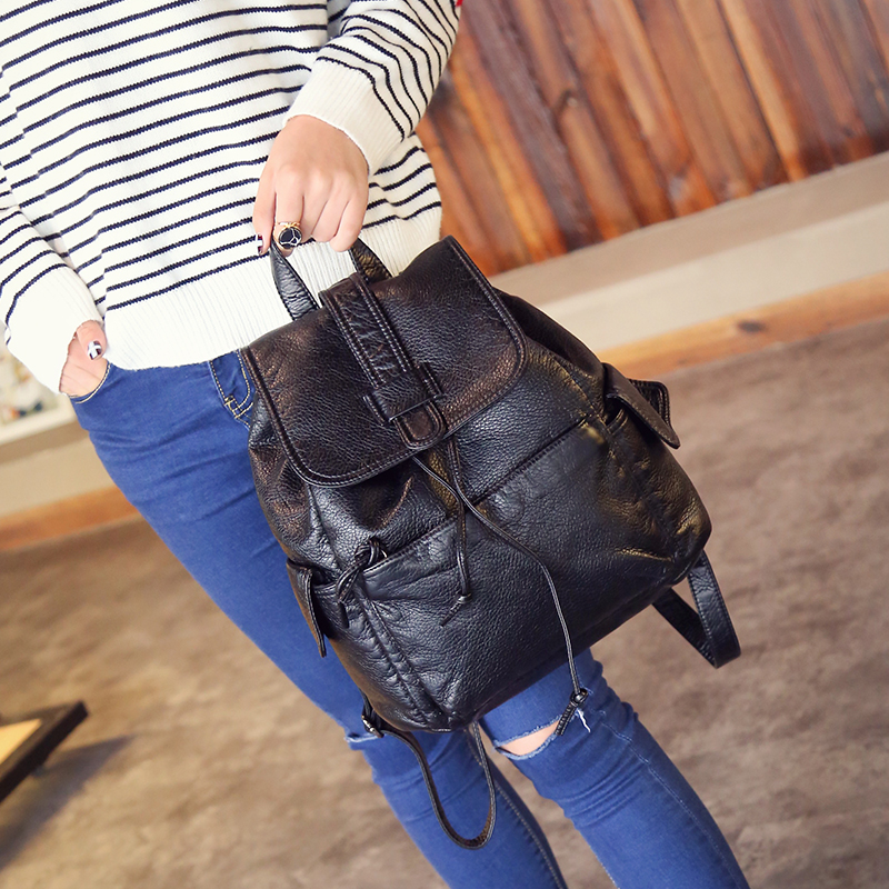 新款韓版雙肩包女水洗皮時尚背包抽帶潮流休閑學院風旅行包包