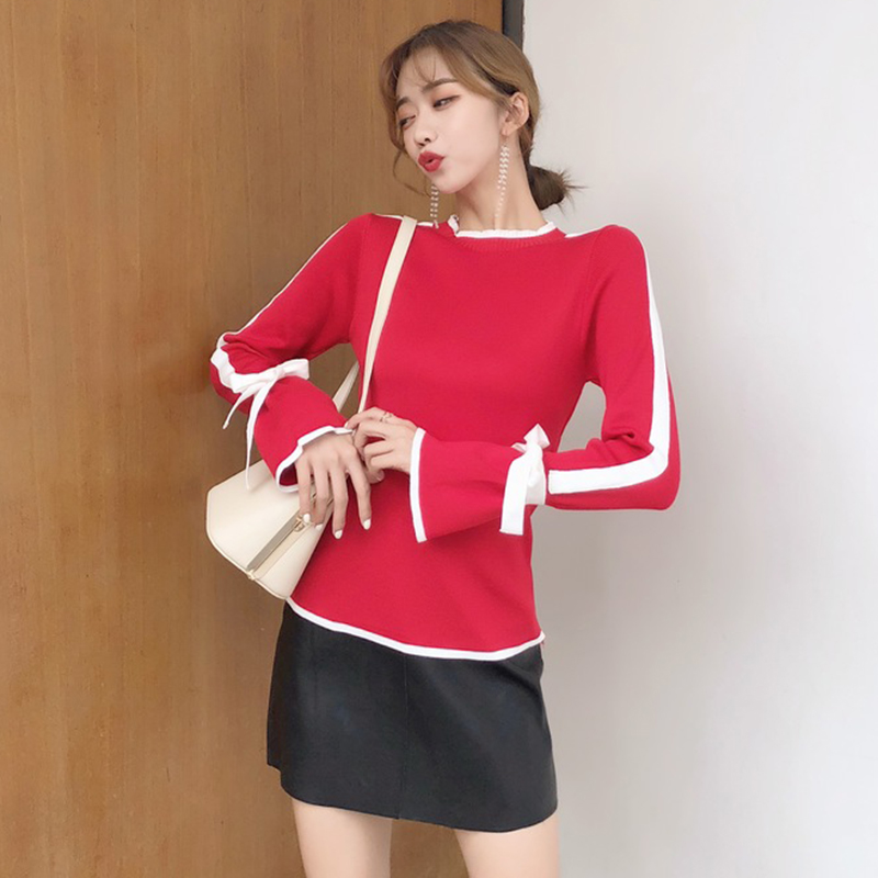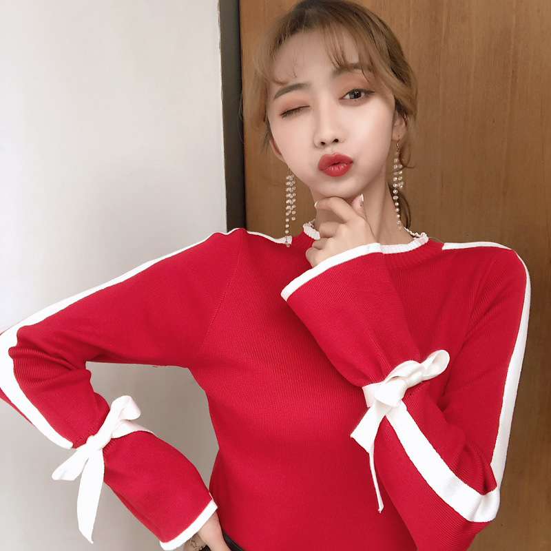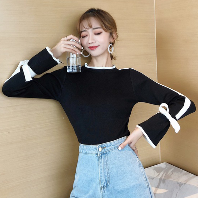/ 洋氣針織衫秋裝女新款港味系帶喇叭長袖拼色上衣氣質修身打底毛衣