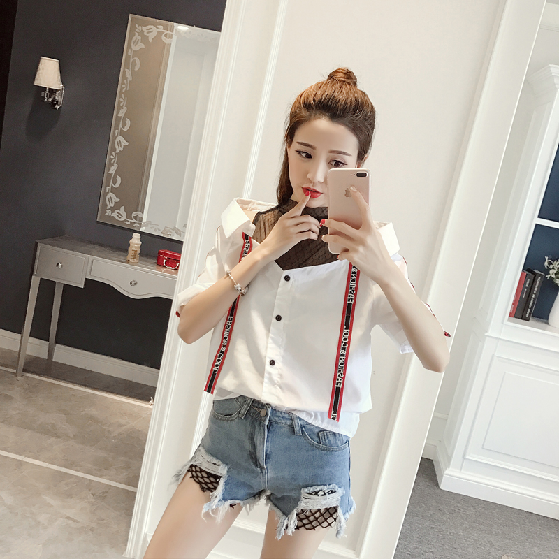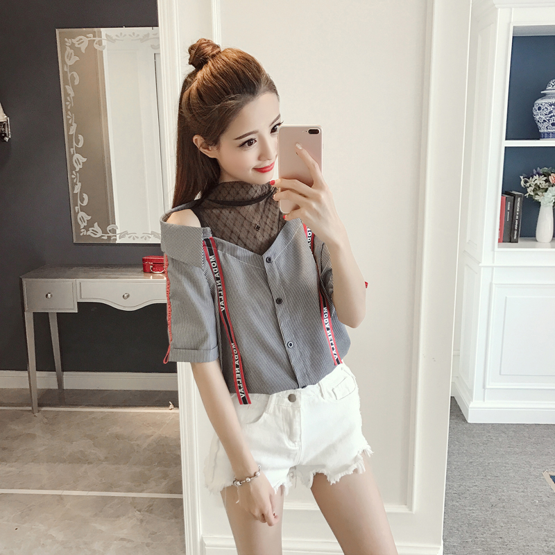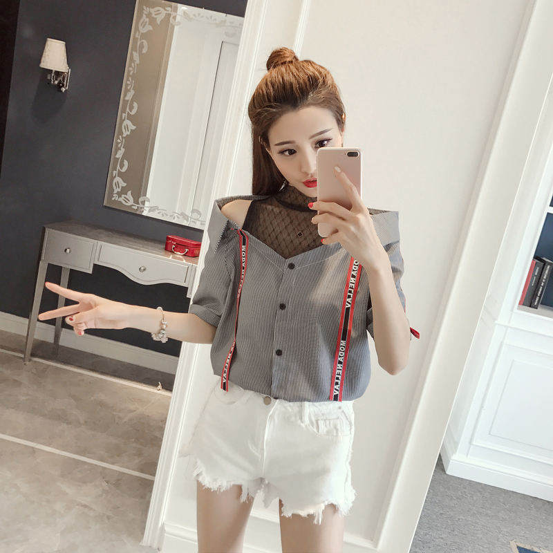 / 夏季新款網紗拼接上衣女韓版短袖襯衣寬松顯瘦條紋露肩襯衫潮