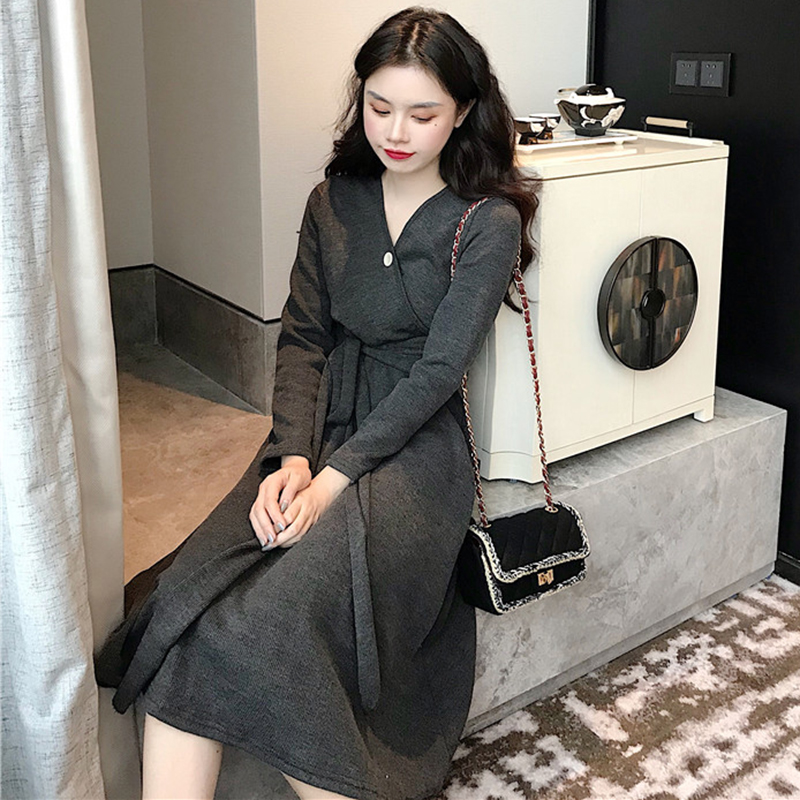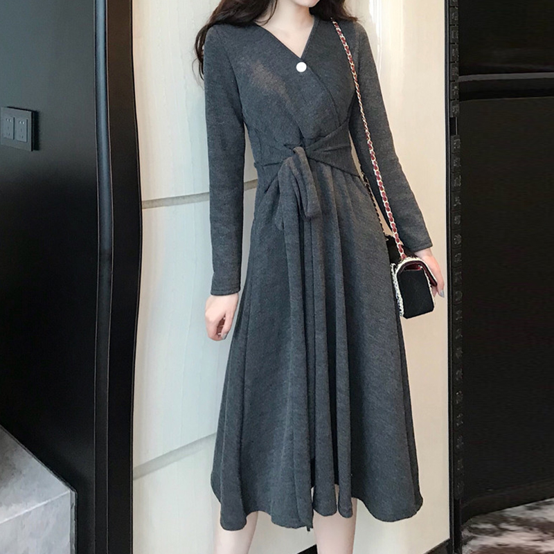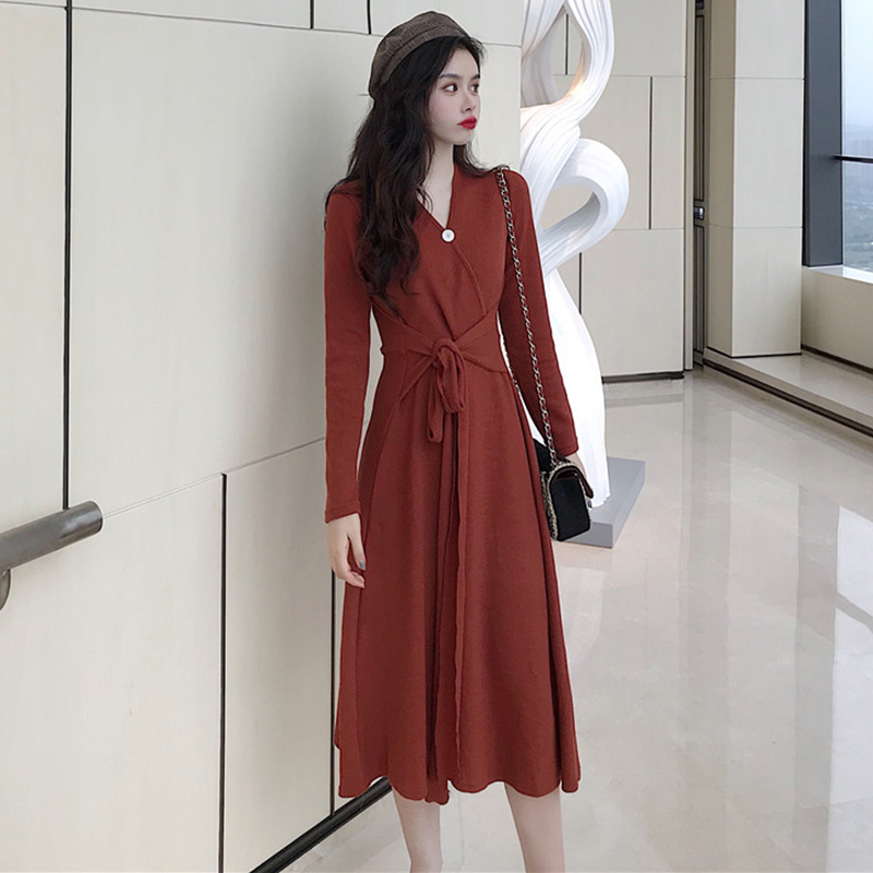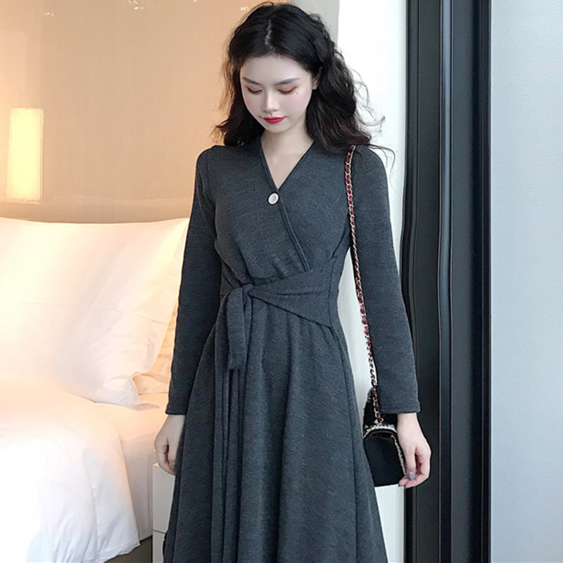 氣質V領收腰顯瘦A字桔梗裙子秋冬裝新款復古法式少女egg連衣長裙