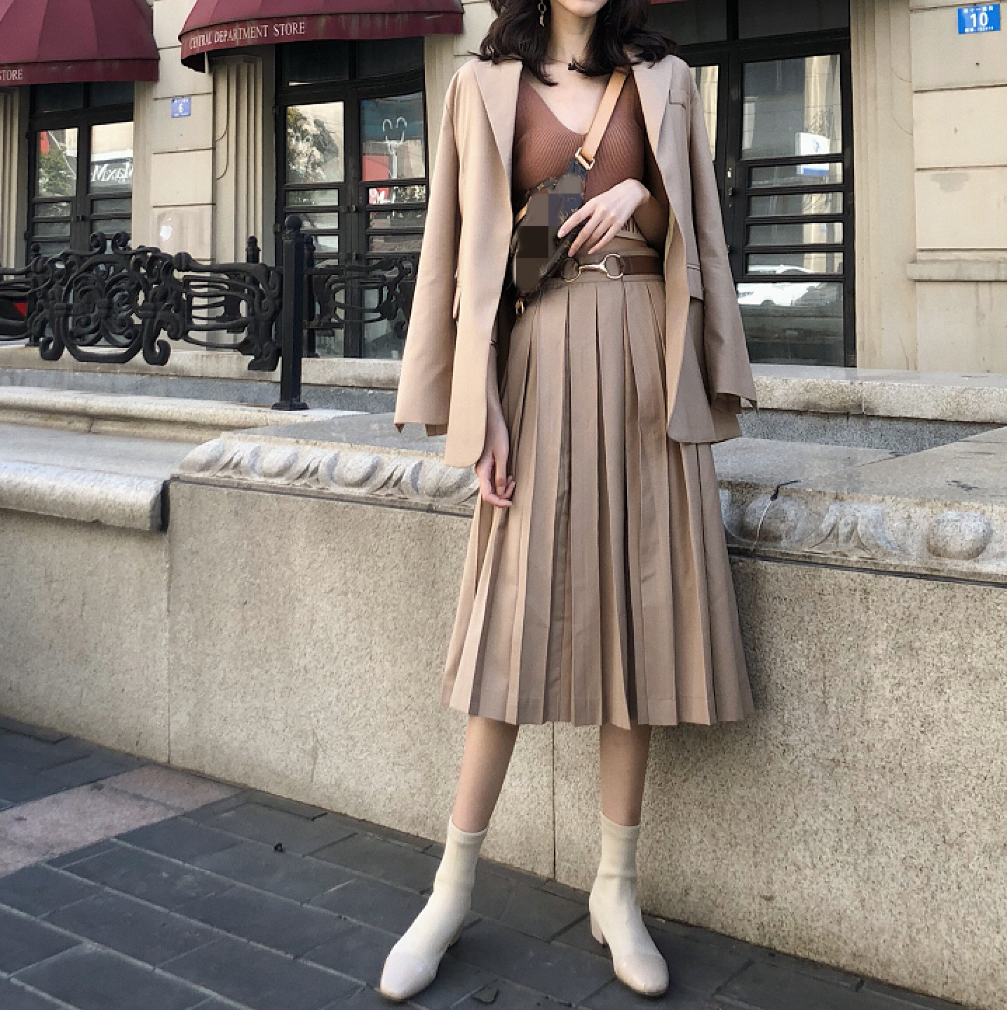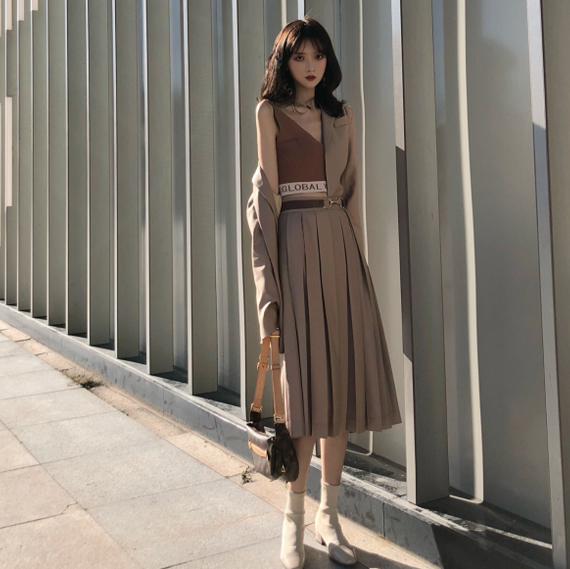 / 秋裝新款時尚百搭西裝高腰百褶半身裙打底針織背心氣質復古套裝女