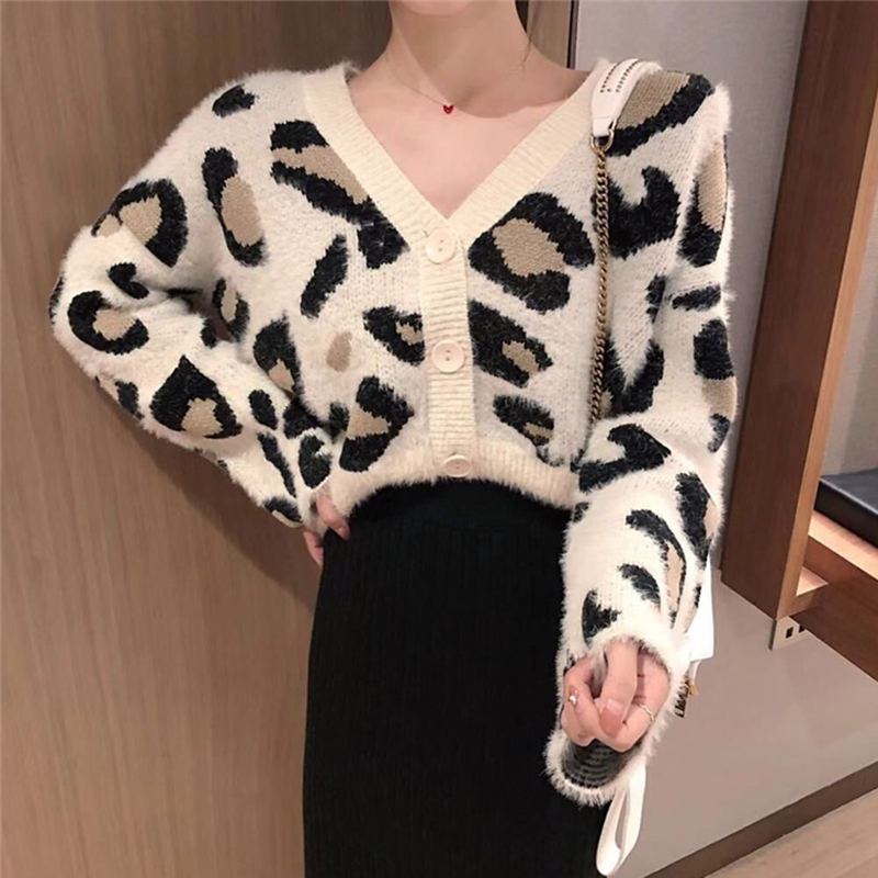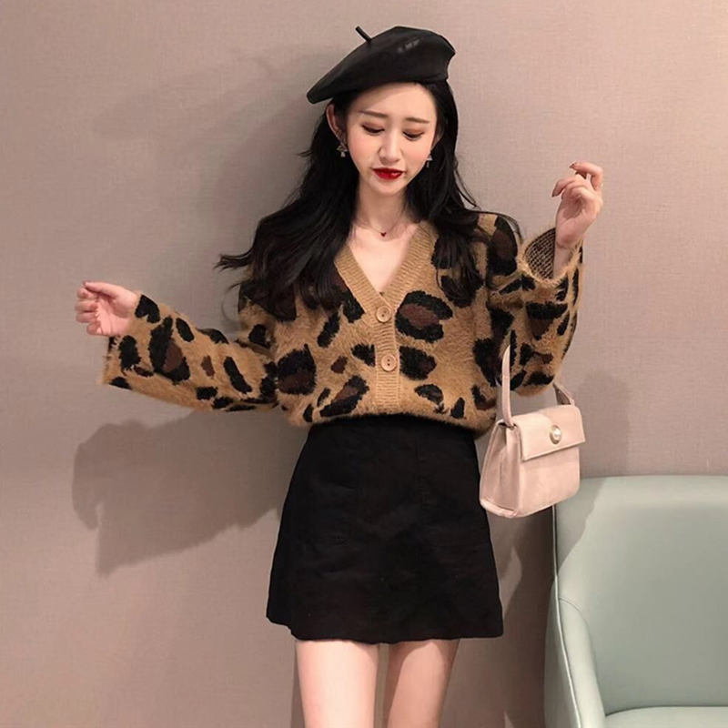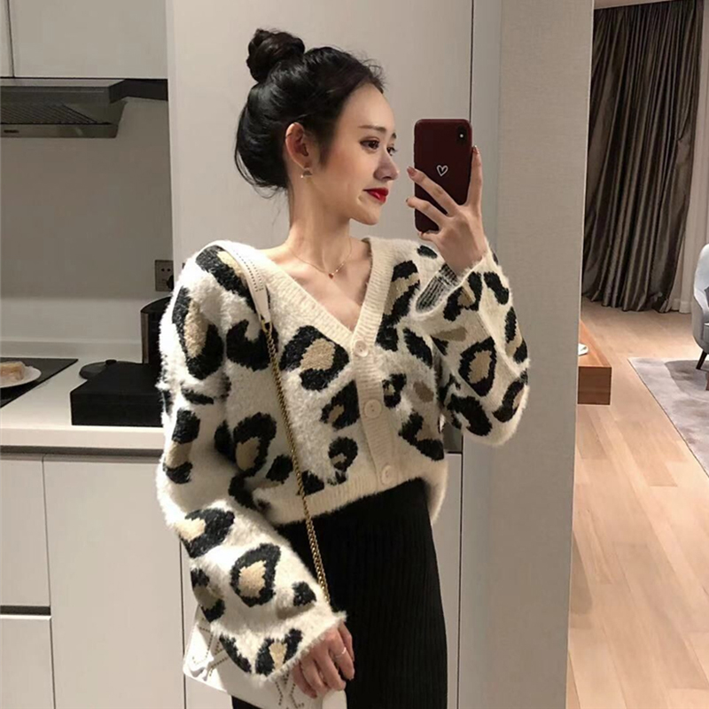 秋冬女裝2018新款韓版慵懶風豹紋針織開衫寬松百搭V領毛衣外套潮
