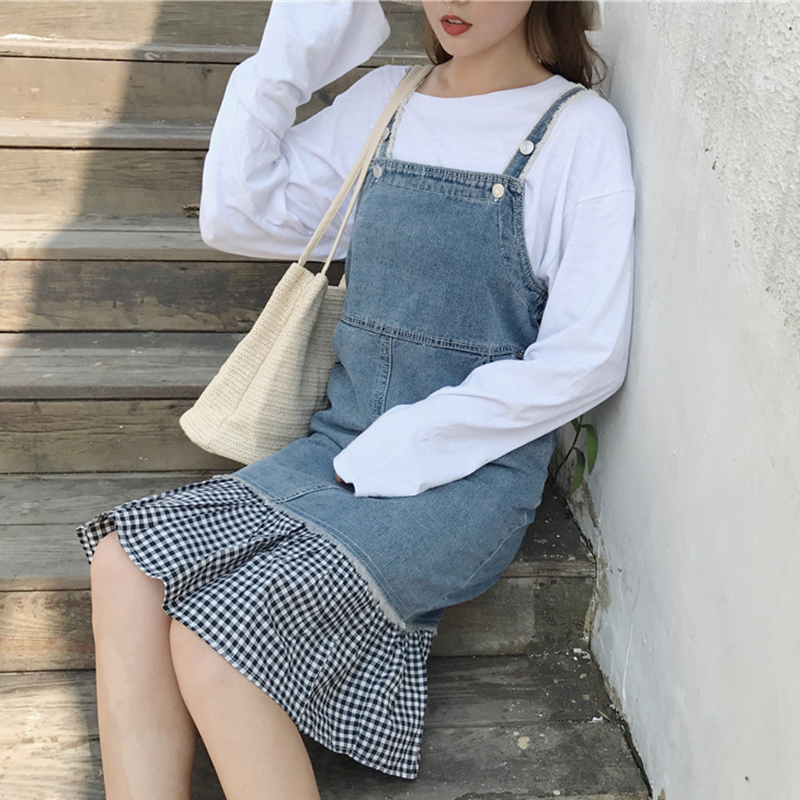 秋裝女2018新款韓版chi風荷葉邊格子拼接牛仔背帶裙時尚連衣裙子