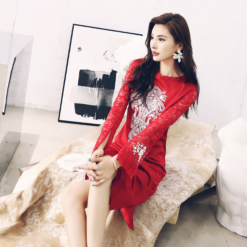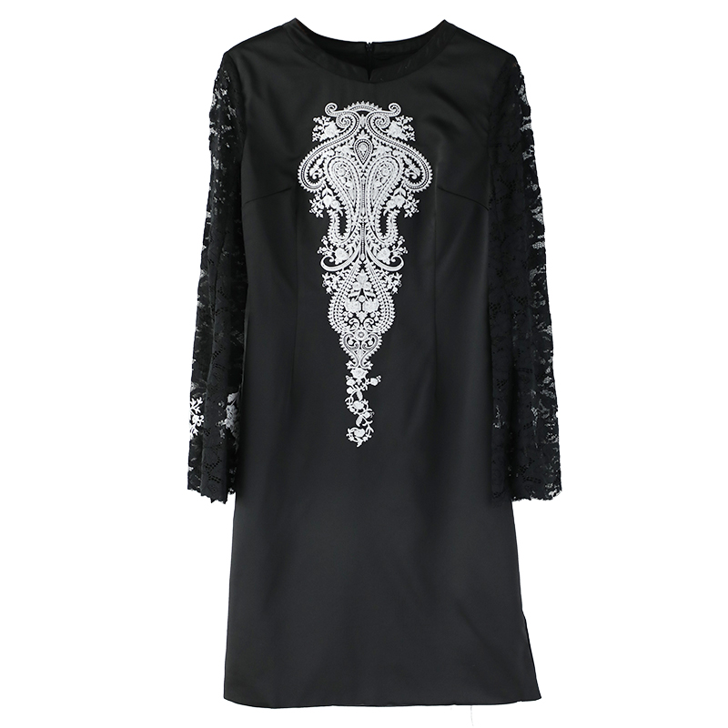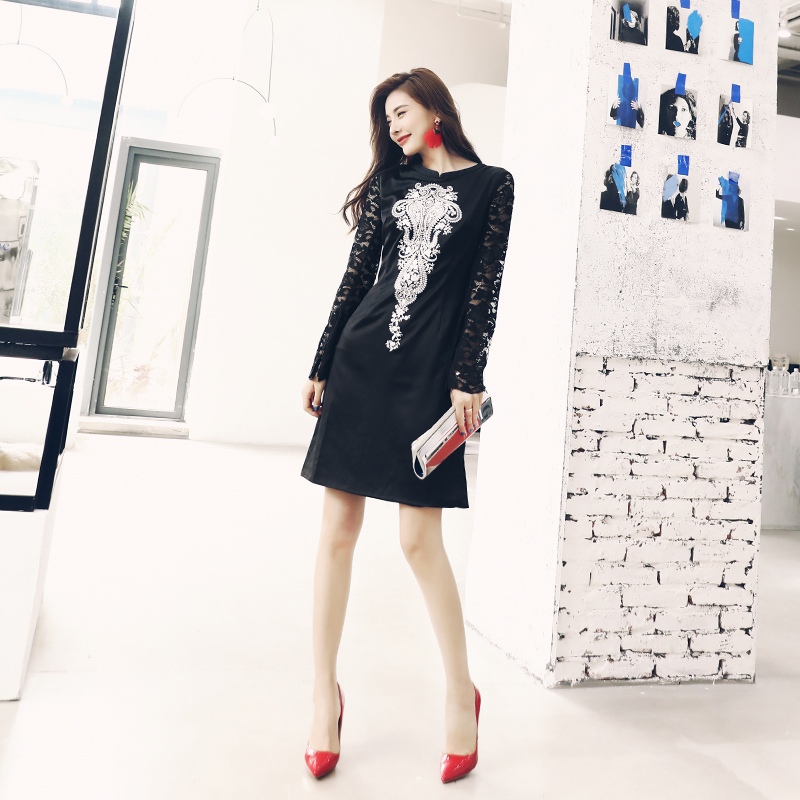 / 名媛氣質2018秋季新款復古淑女刺繡繡花蕾絲拼接連衣裙禮服裙子潮