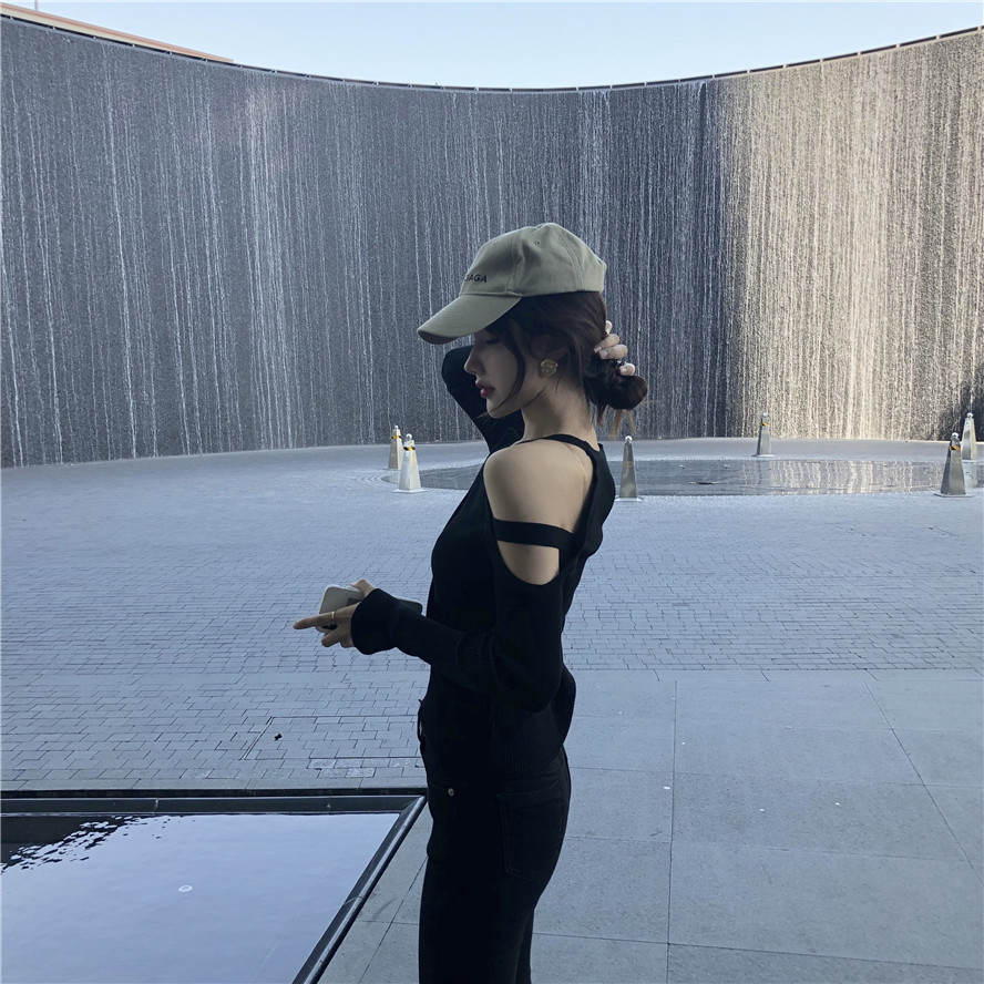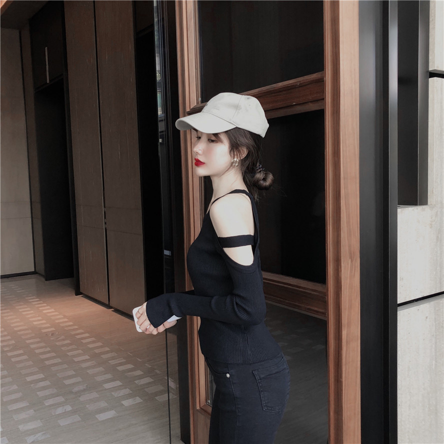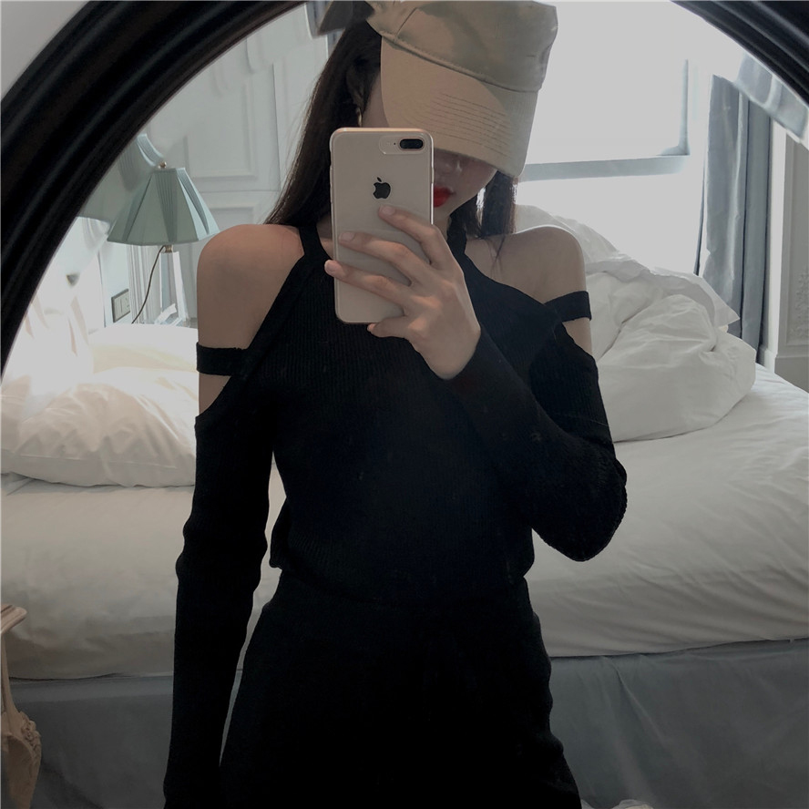 / chic早秋毛衣慵懶風網紅同款性感氣質小心機鏤空露肩長袖針織衫女