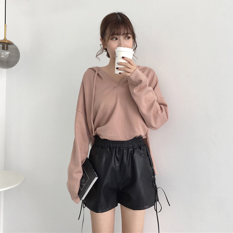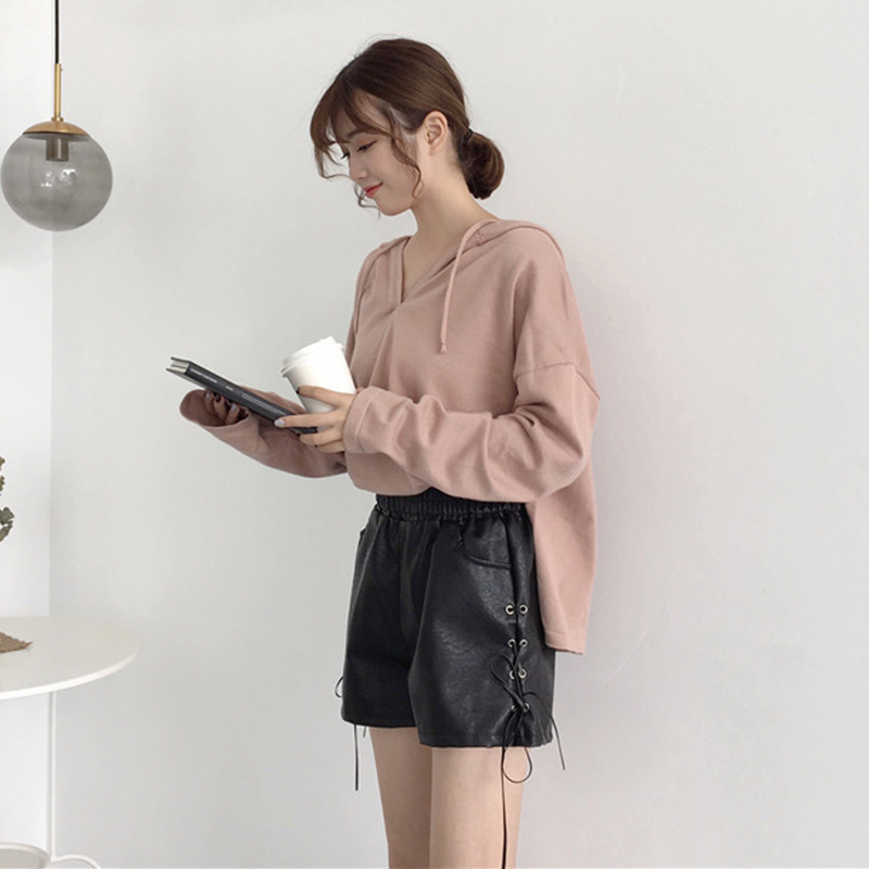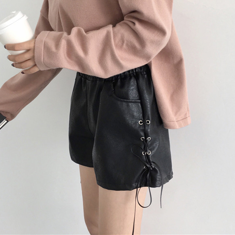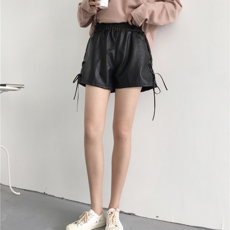 / 個性綁帶PU皮褲子秋裝女2018新款高腰顯瘦短褲學生休閑寬松闊腿褲