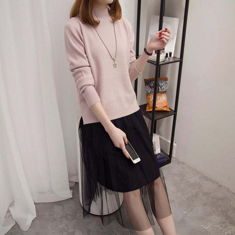 / 半高領針織衫秋冬季新款韓版打底衫雪紡連衣裙冬季新款毛衣女