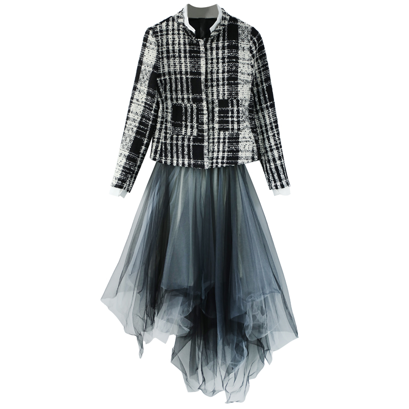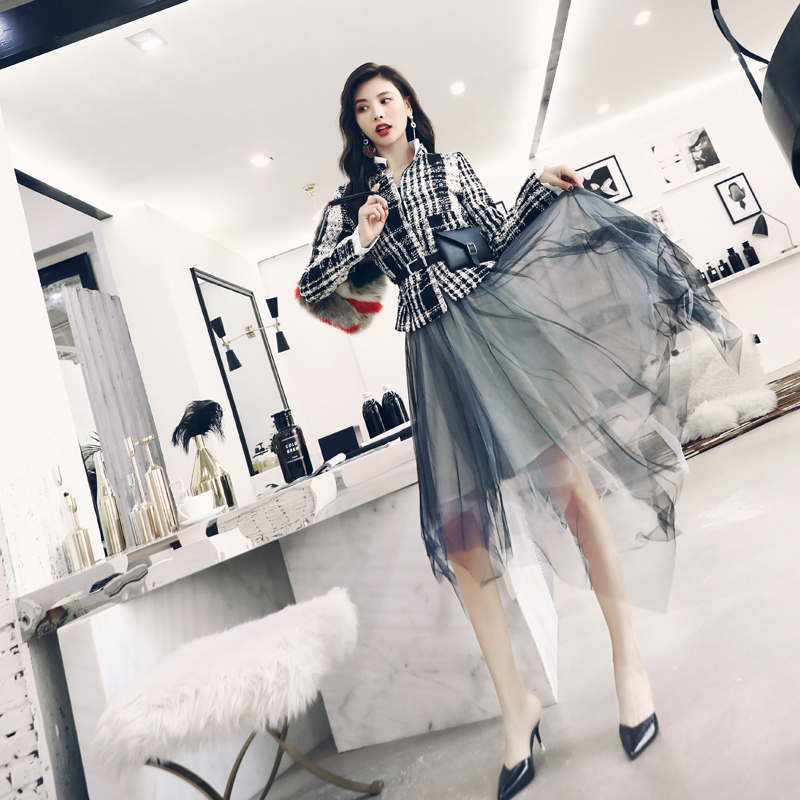 女西裝套裝2018新款兩件套氣質長袖小香毛呢上衣中長款網紗半身裙