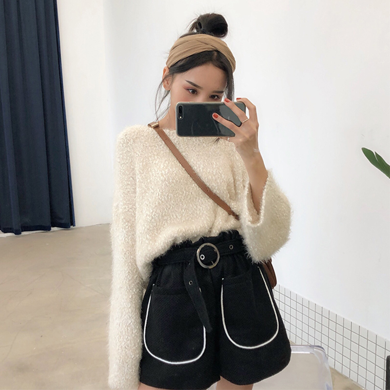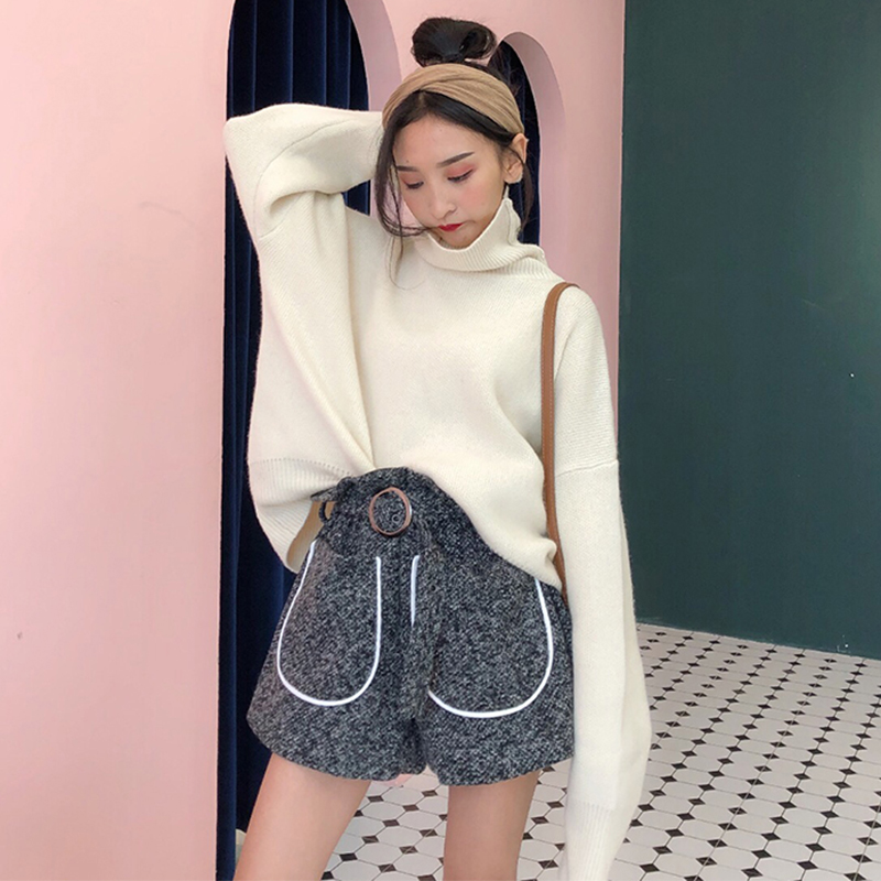 chic風毛呢撞色闊腿褲女秋冬裝2018新款韓版高腰寬松顯瘦短靴褲子