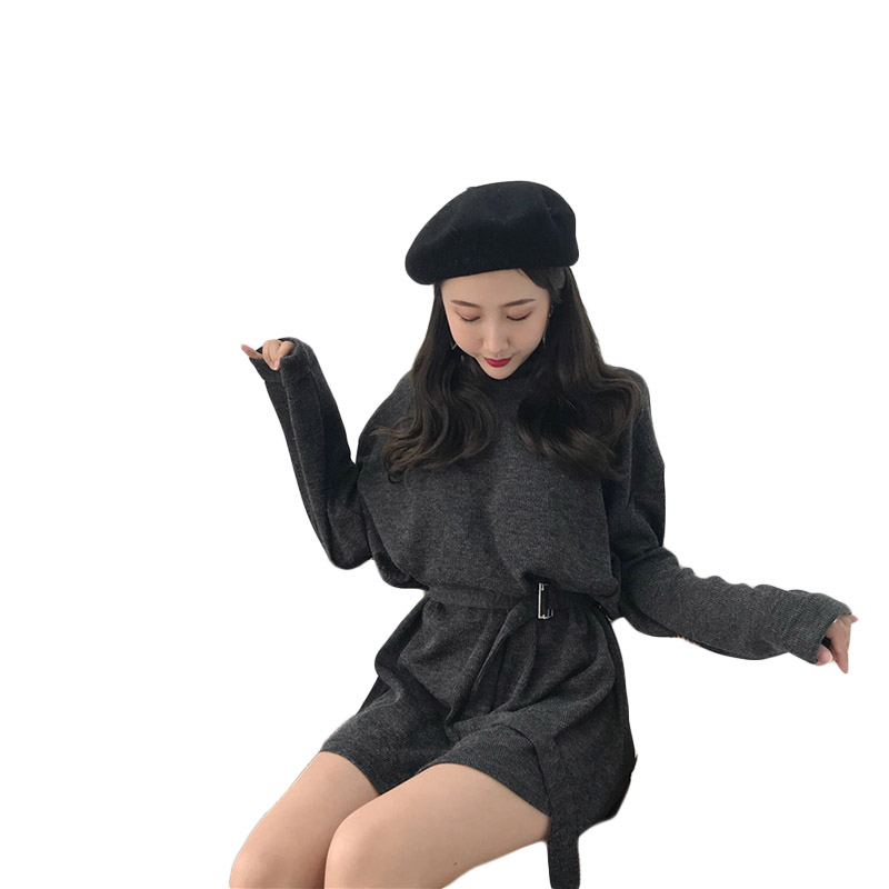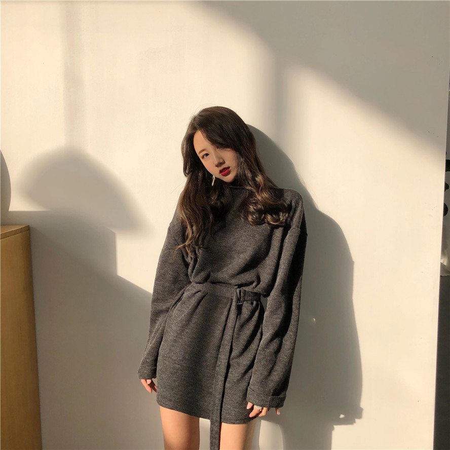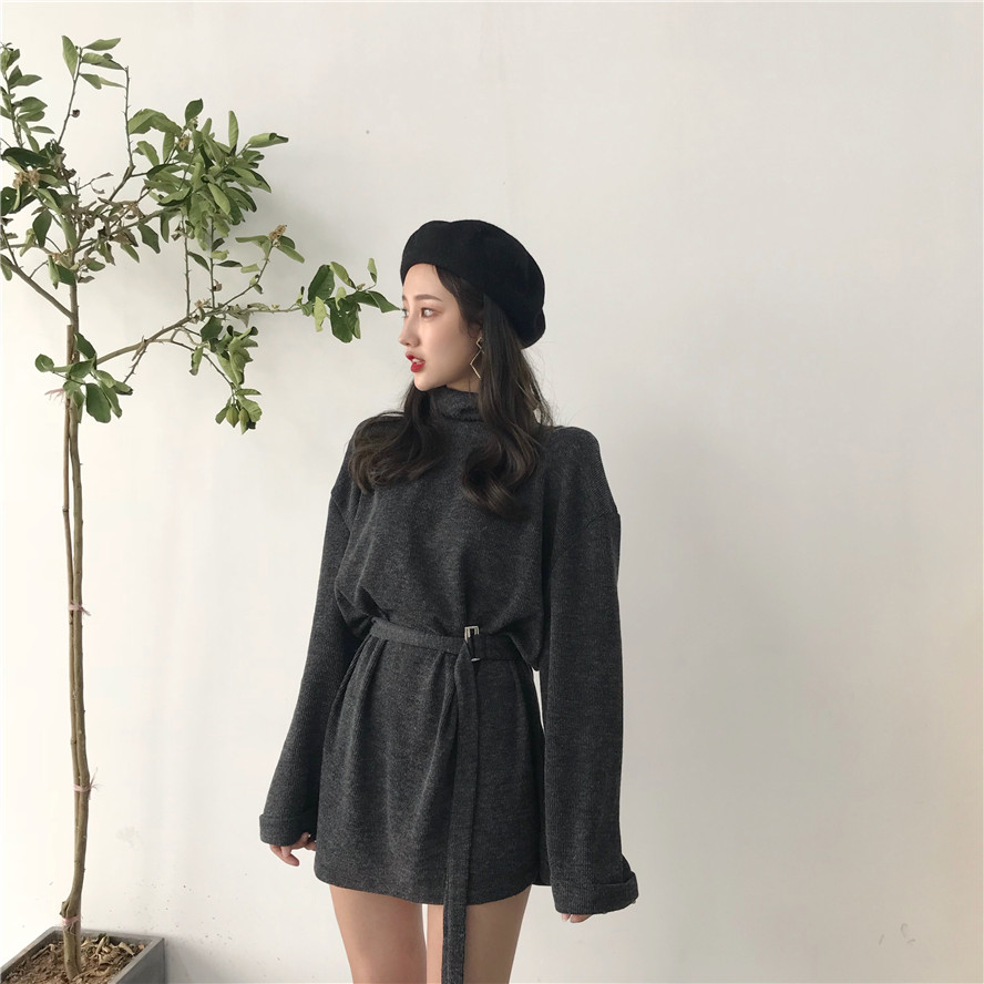 / 韓國chic風復古寬松含腰帶收腰顯瘦氣質高領懷舊慵懶長袖連衣裙女