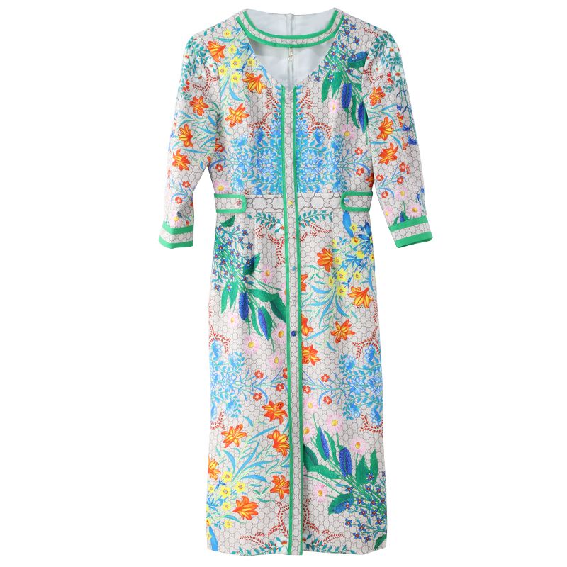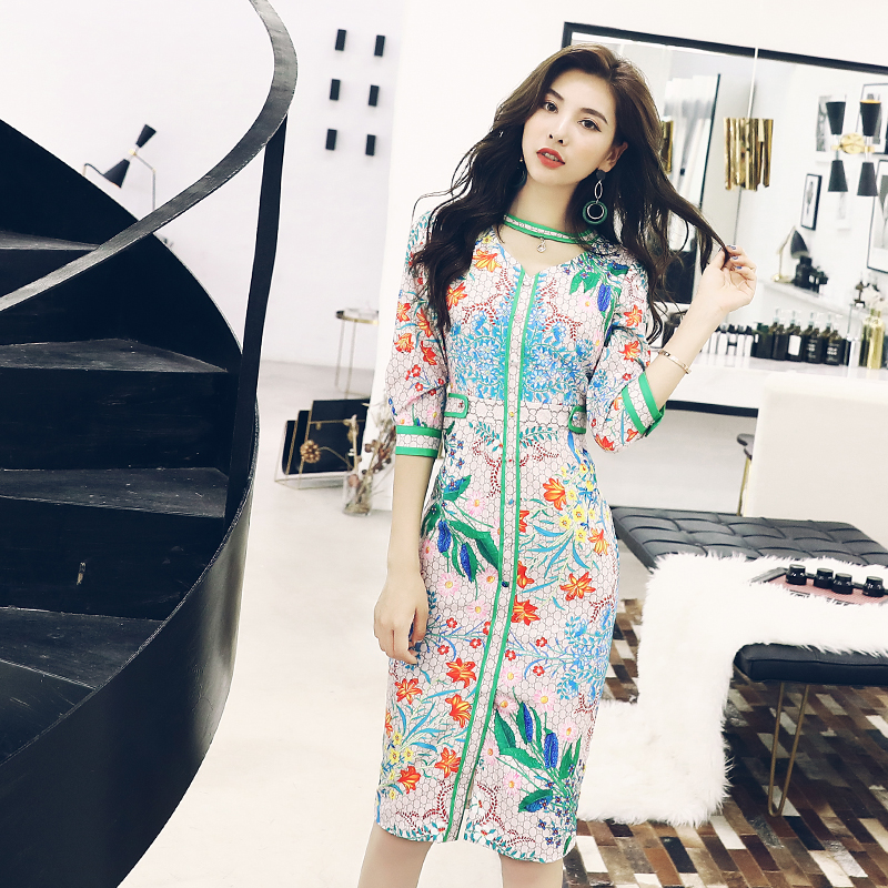 2018秋裝新款女裝印花連衣裙女夏季時尚七分袖中長款收腰開叉裙子