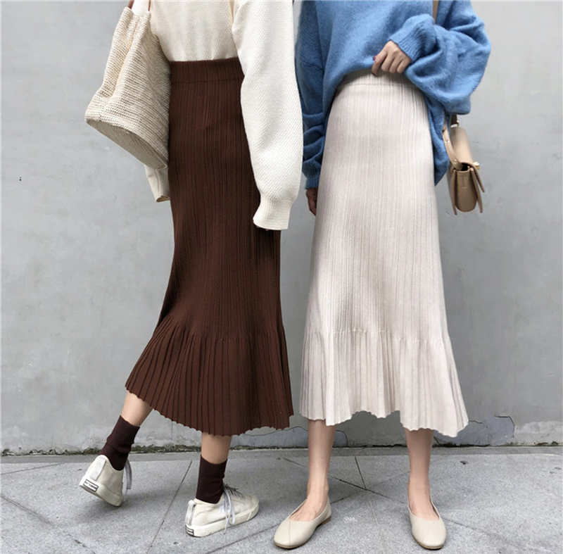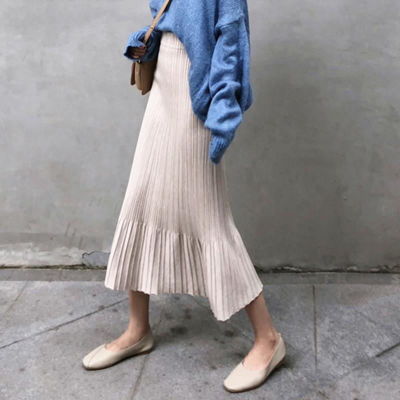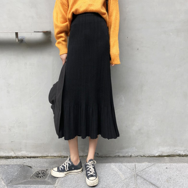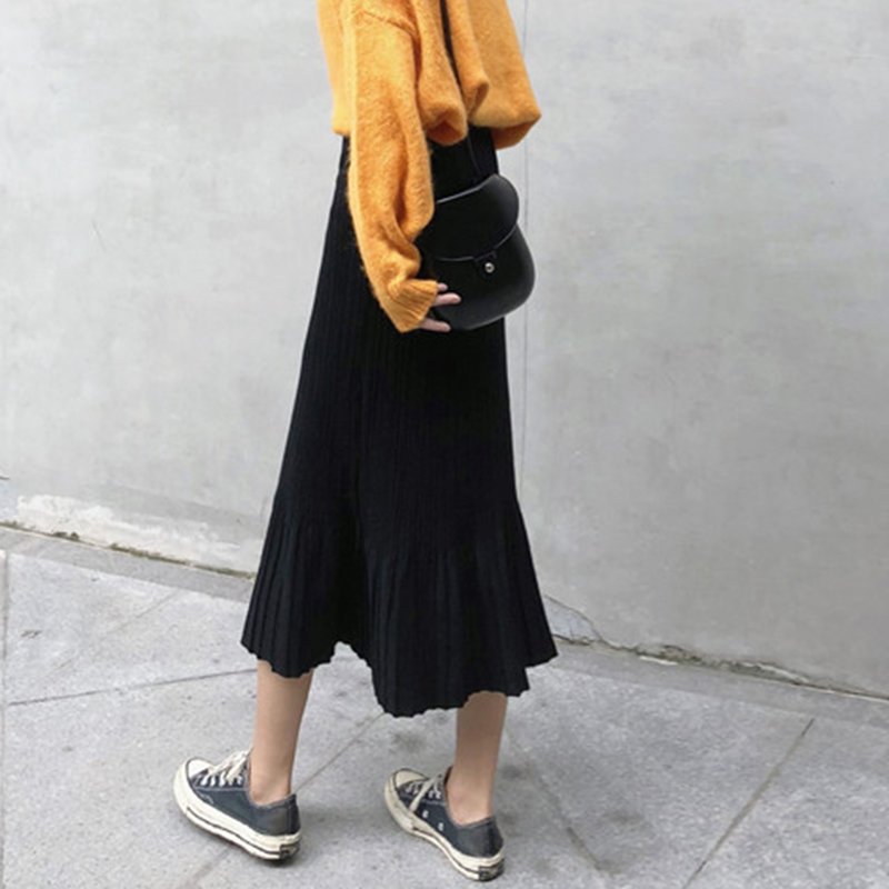 / 針織裙女2018新款秋裝復古高腰魚尾半身裙學生中長百褶A字黑裙子