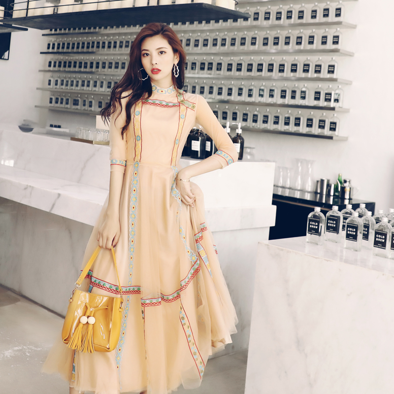 / 名媛氣質網紗刺繡歐洲站秋款連衣裙繡花長裙歐貨女神范中長款裙子