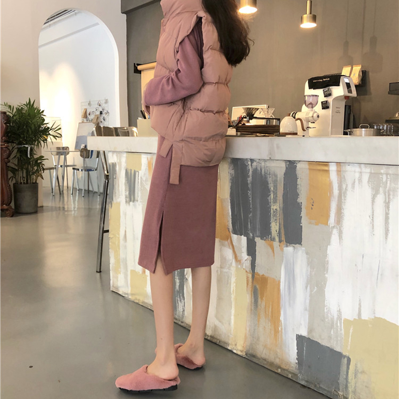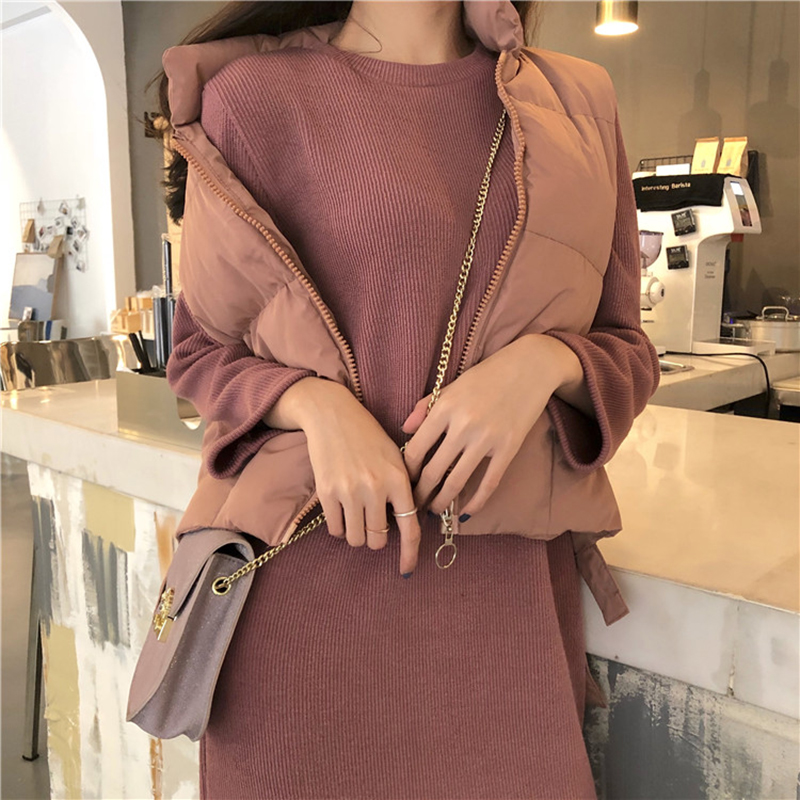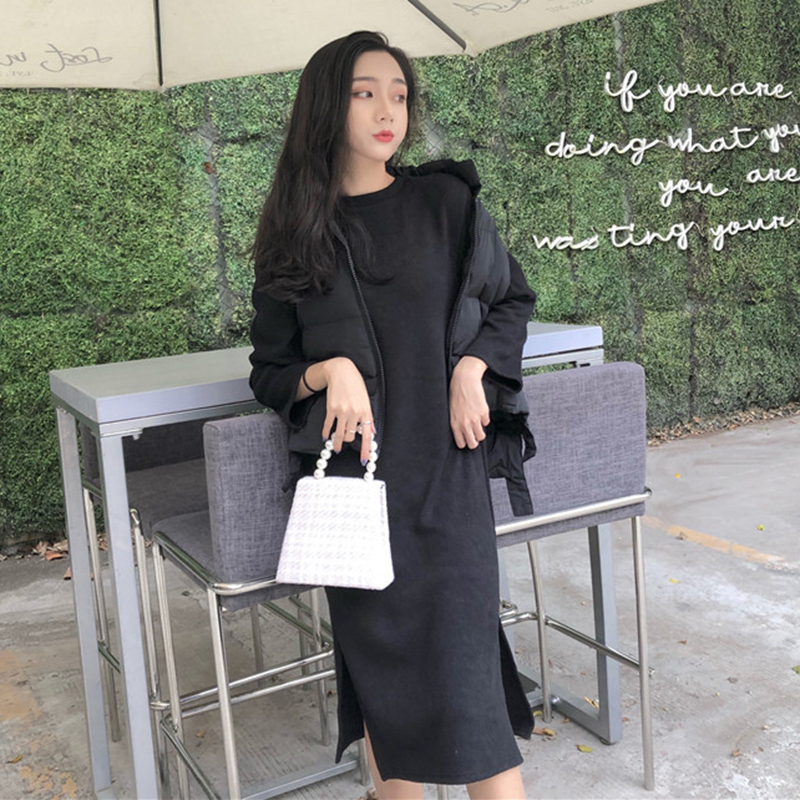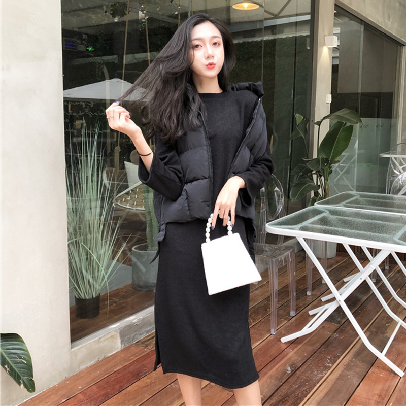 / 秋裝新款短款棉服馬夾外套休閑純色開叉長袖打底連衣裙子兩件套女