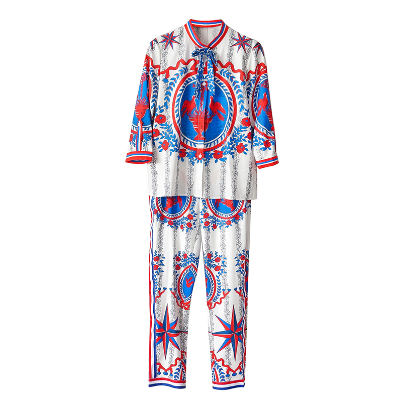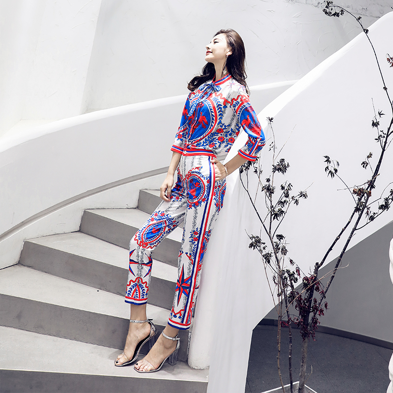 / 歐洲站復古港味社會套裝女歐貨襯衫高腰小腳褲兩件套2018夏秋季