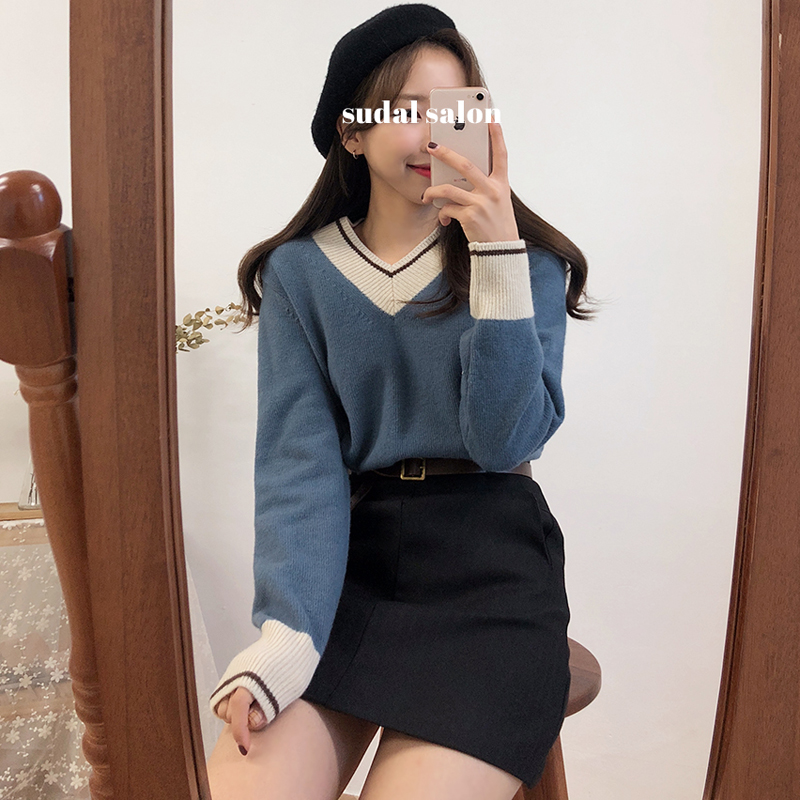 / 韓國慵懶風套頭毛衣女冬2018新款復古百搭條紋撞色V領長袖打底衫