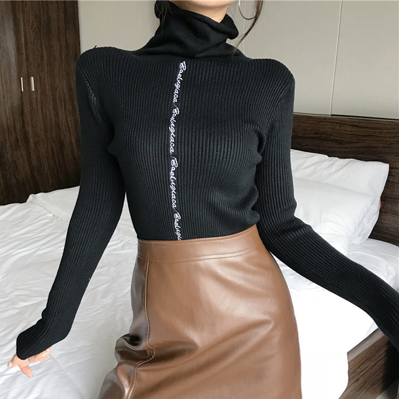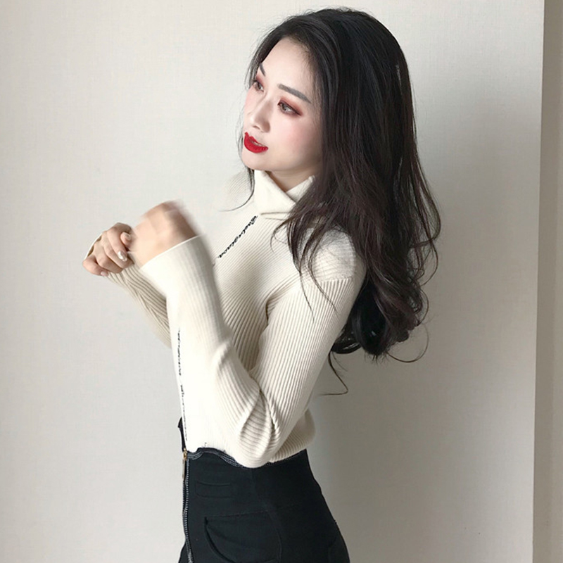 / 高領修身顯瘦打底針織衫女秋冬裝新款學院風字母長袖黑色T恤上衣