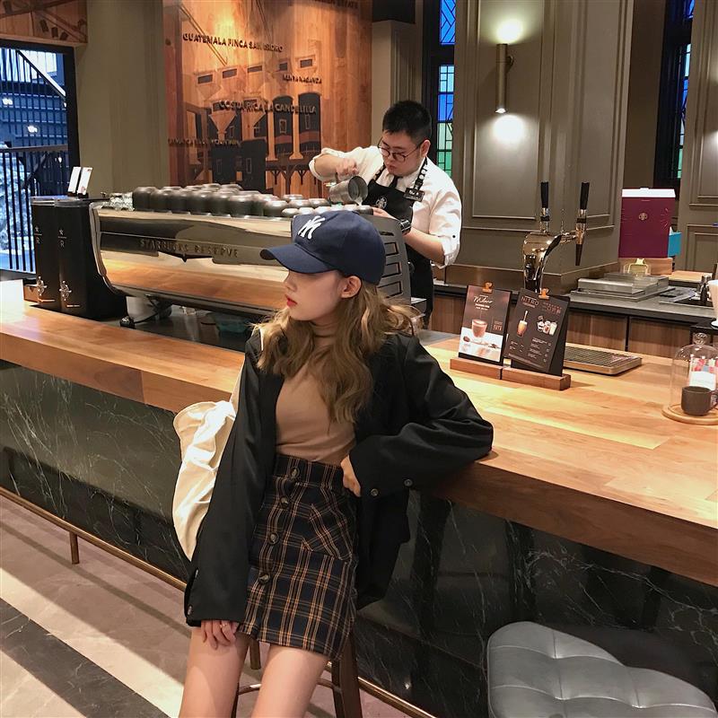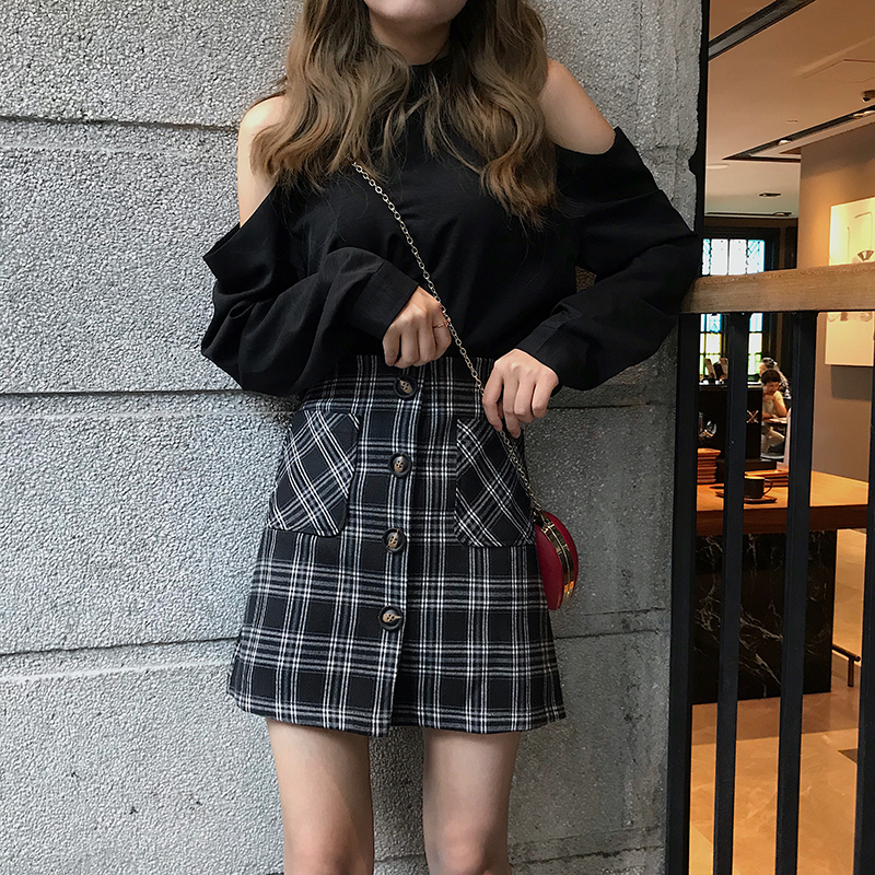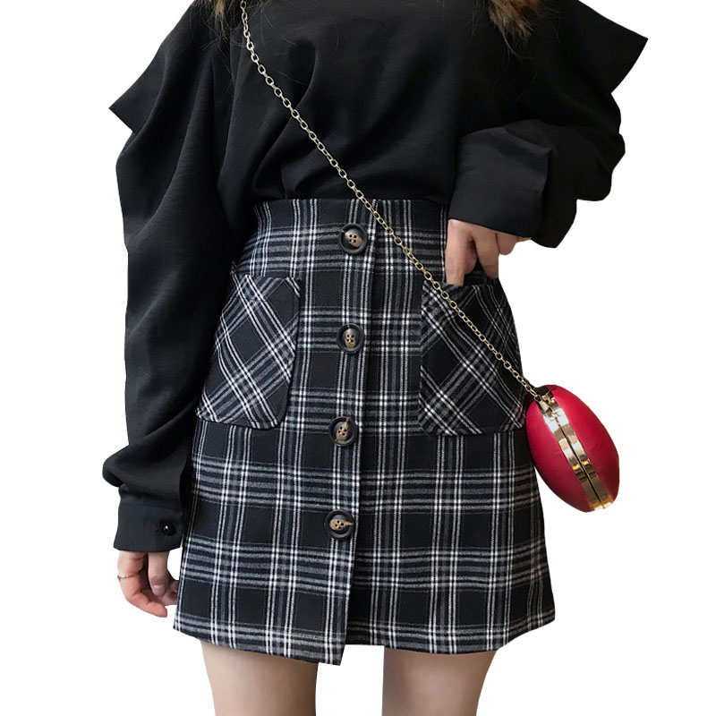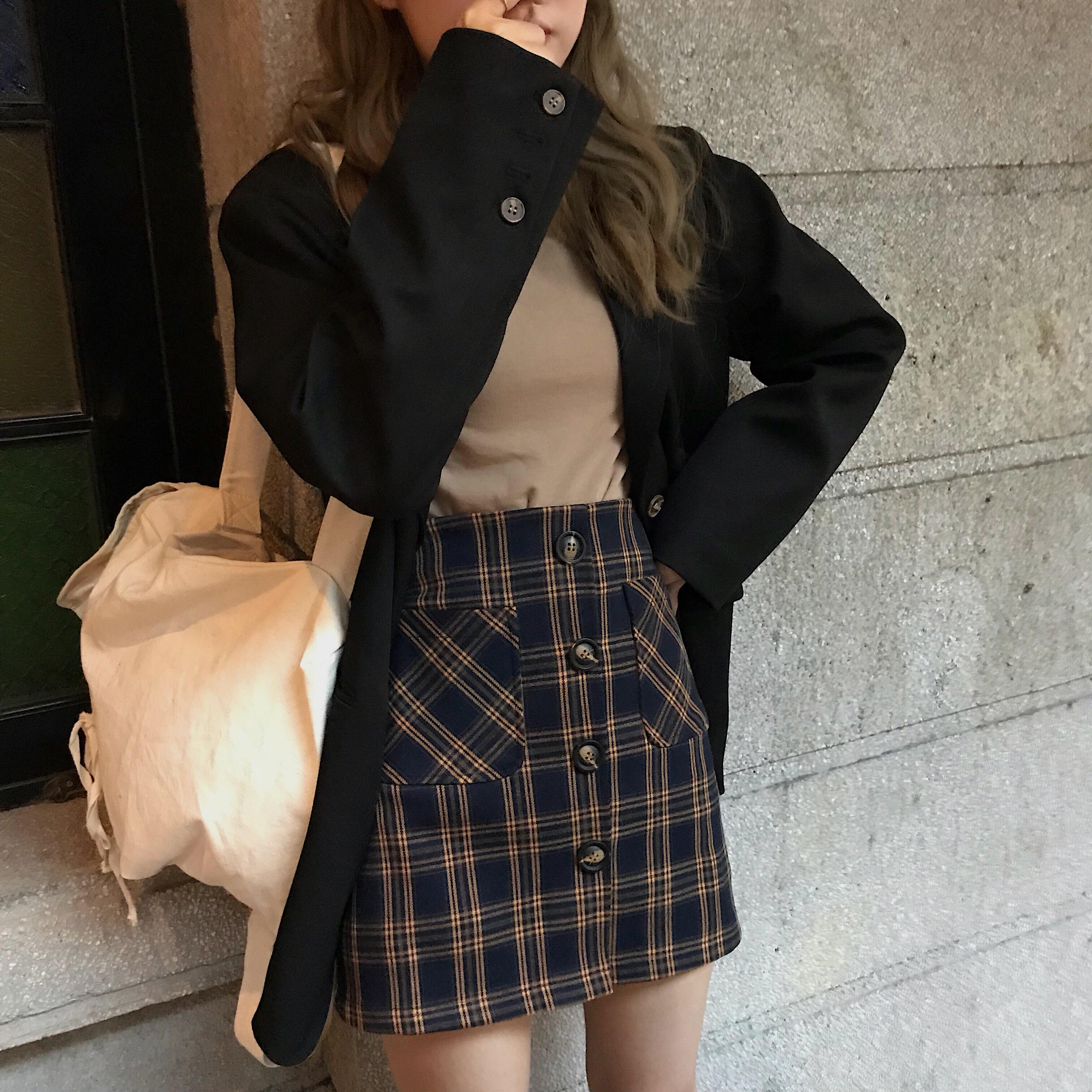 / 秋季女裝韓版chic復古高腰顯瘦格子排扣A字裙半身裙短裙學生裙子