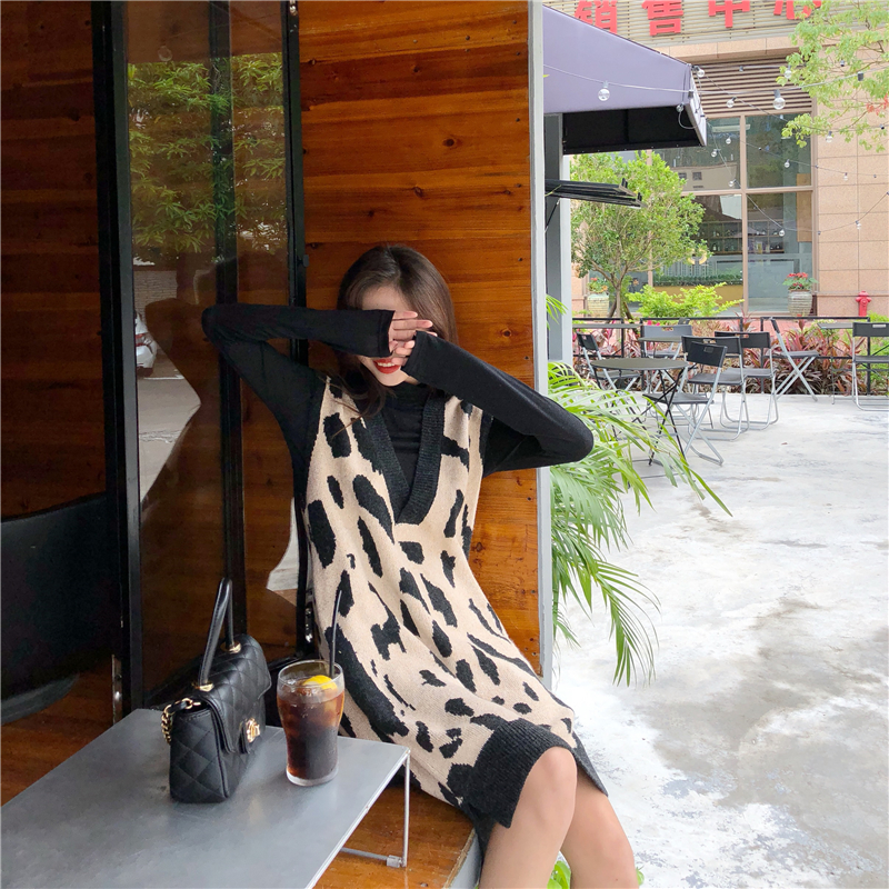秋冬時尚女裝新款韓版chic慵懶風寬松百搭豹紋V領中長款針織馬甲