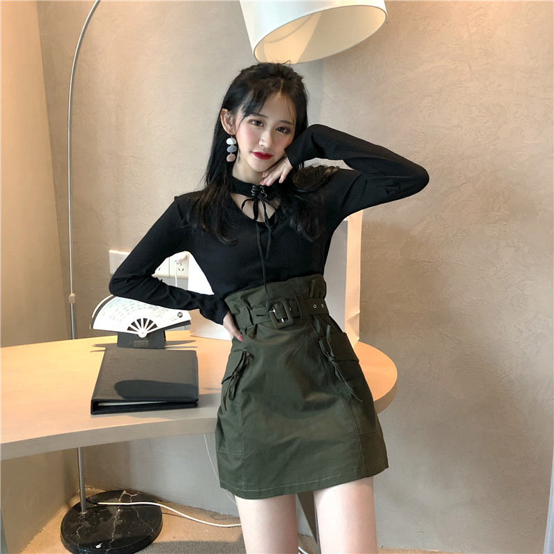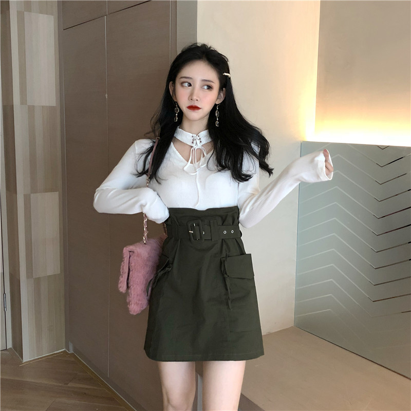 2018秋裝新款韓版時尚套裝復古掛脖心機系帶打底衫百搭口袋花苞裙