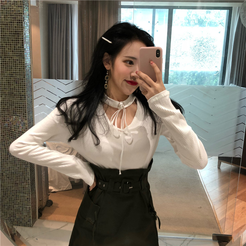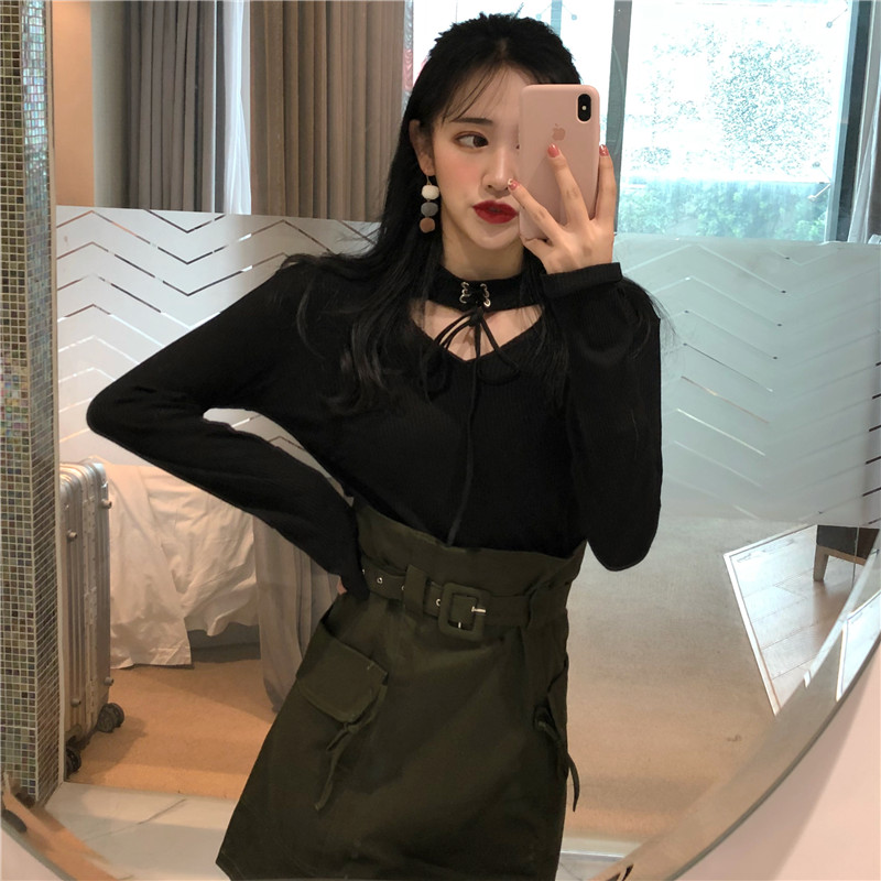 / 2018秋裝新款韓版時尚套裝復古掛脖心機系帶打底衫百搭口袋花苞裙
