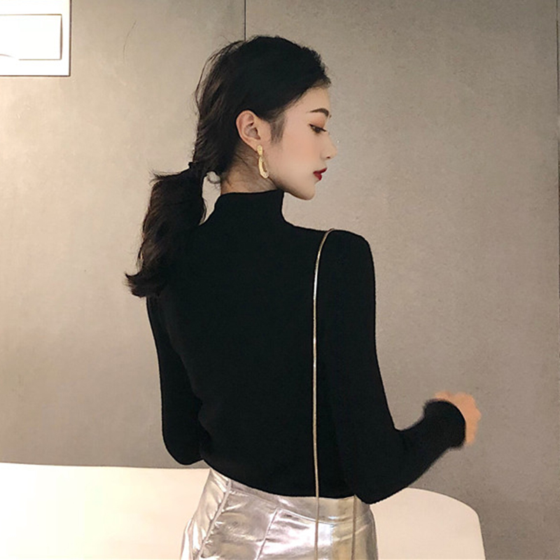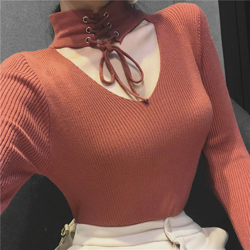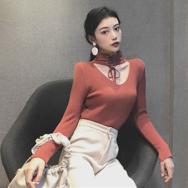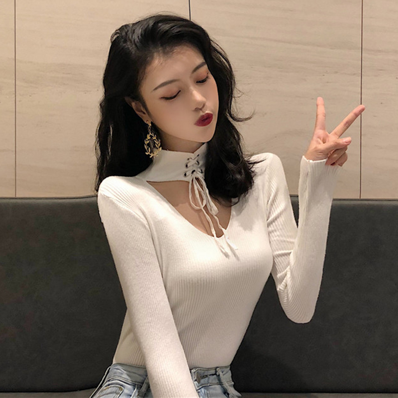 港味心機掛脖鏤空V領系帶針織打底衫秋裝女新款修身長袖緊身上衣