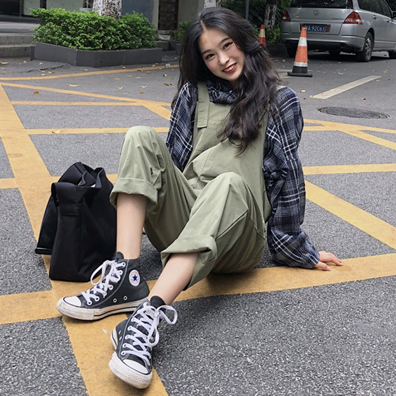 秋裝女2018新款原宿風連體工裝背帶褲學生韓版女裝寬松黑色闊腿褲