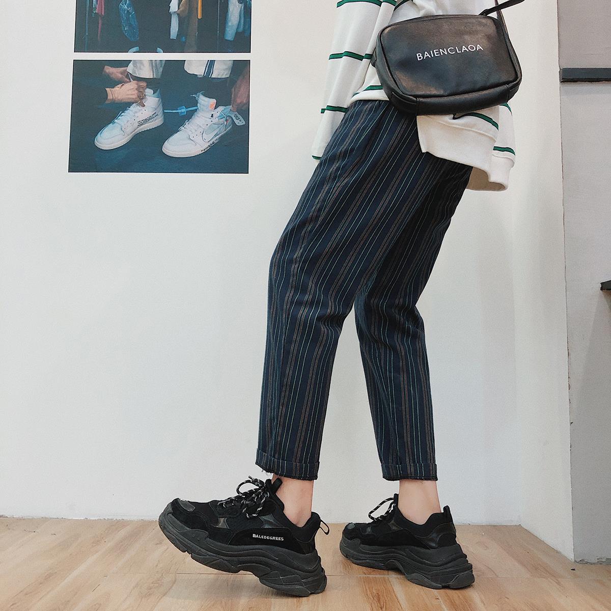 / 古著vintage褲子男條紋九分褲秋季韓版運動褲寬松哈倫潮流休閑褲