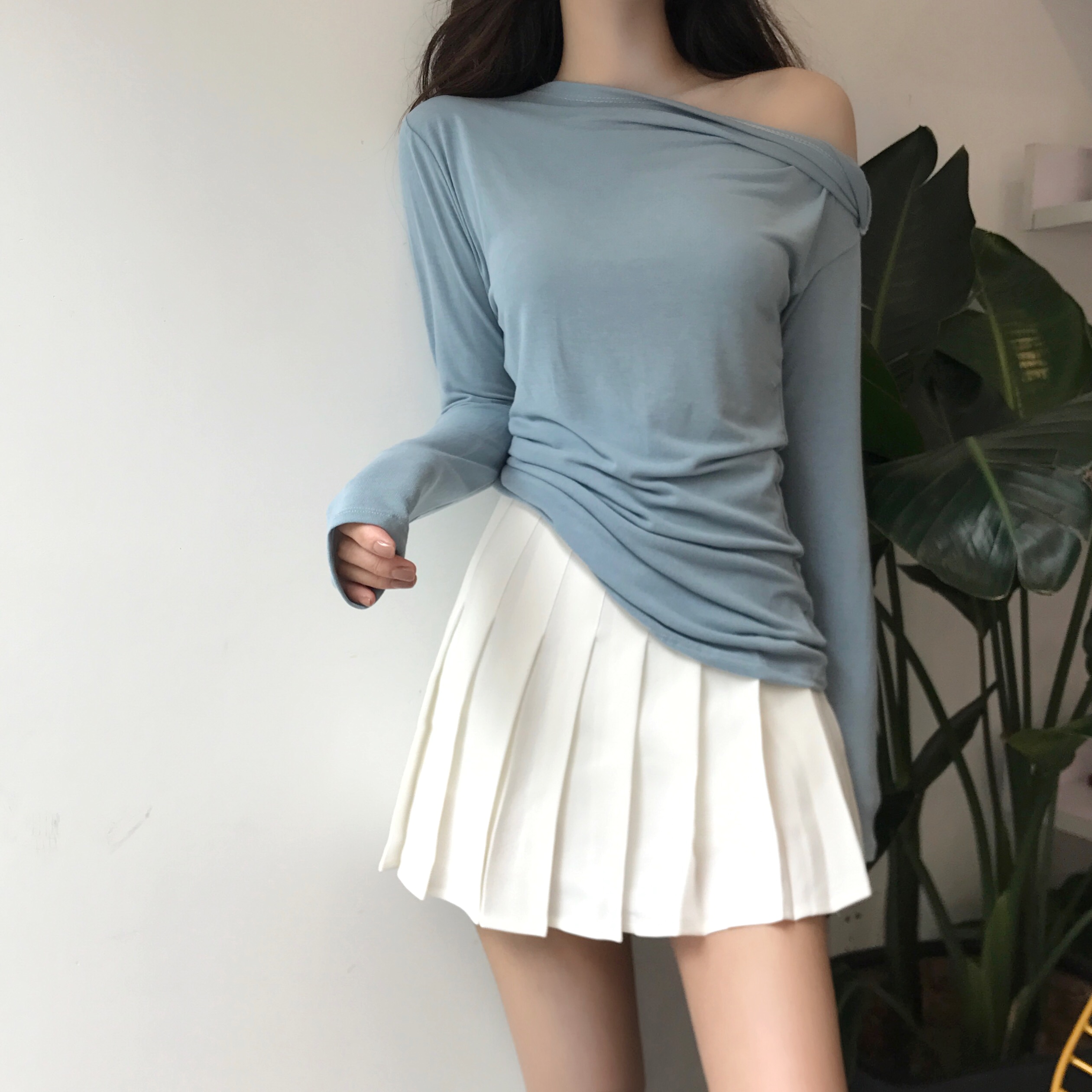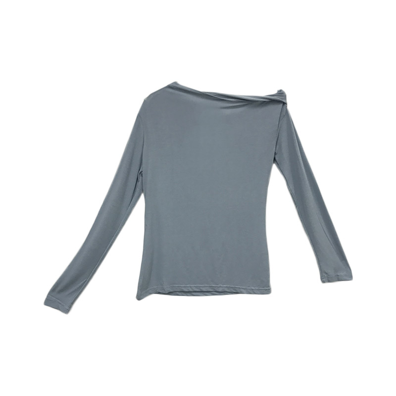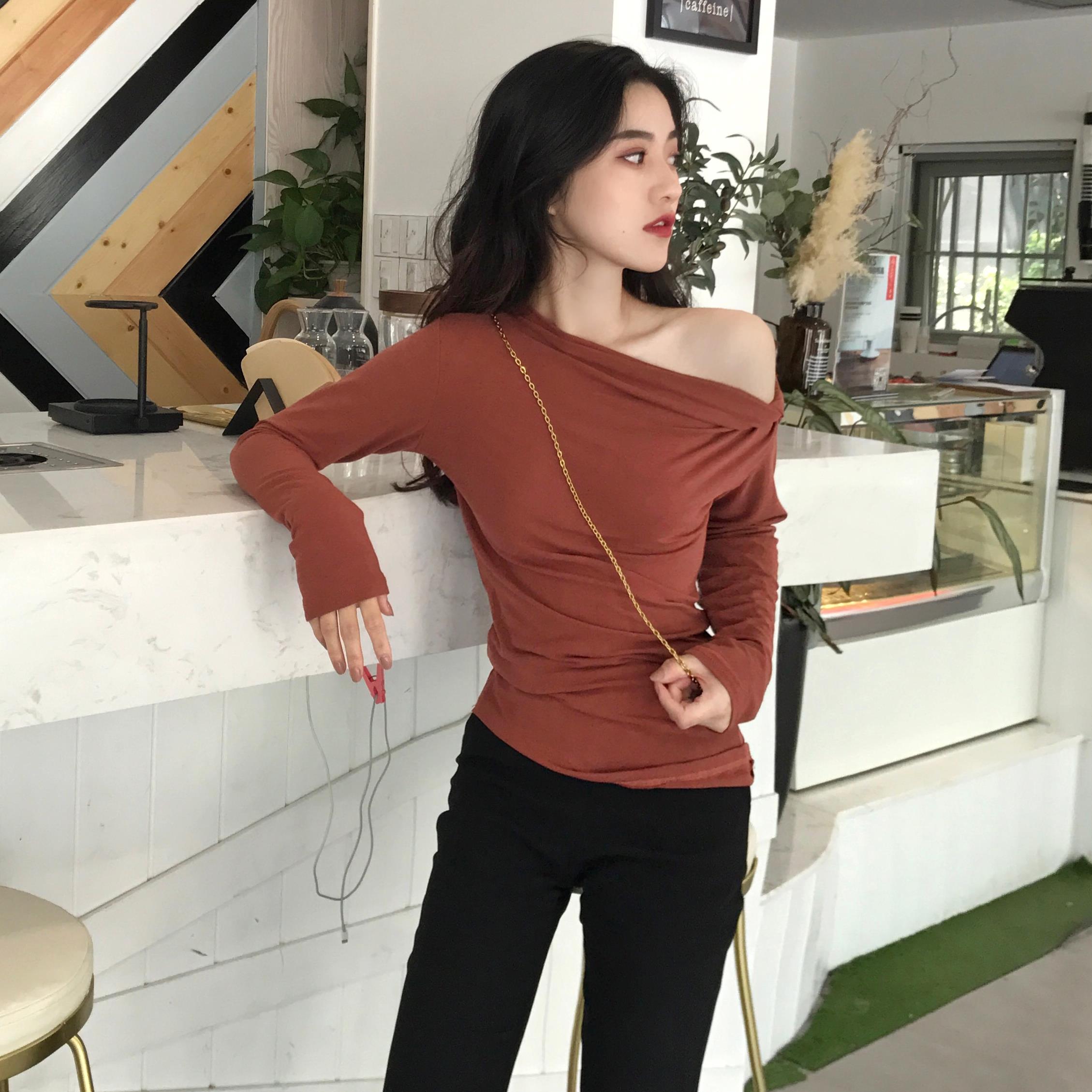 早秋新款純色修身氣質斜領露鎖骨港味復古一字肩上衣時尚氣質T恤