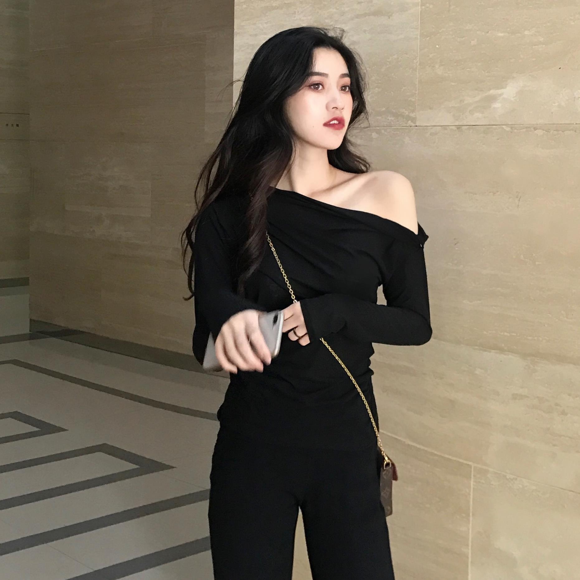 秋裝女2018新款百搭一字肩上衣小心機露肩長袖體恤漏肩內搭打底衫