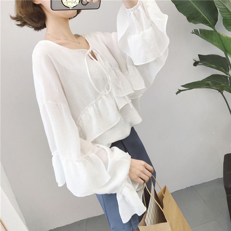 / 秋裝女2018新款韓版氣質荷葉邊長袖雪紡襯衫時尚洋氣寬松系帶上衣