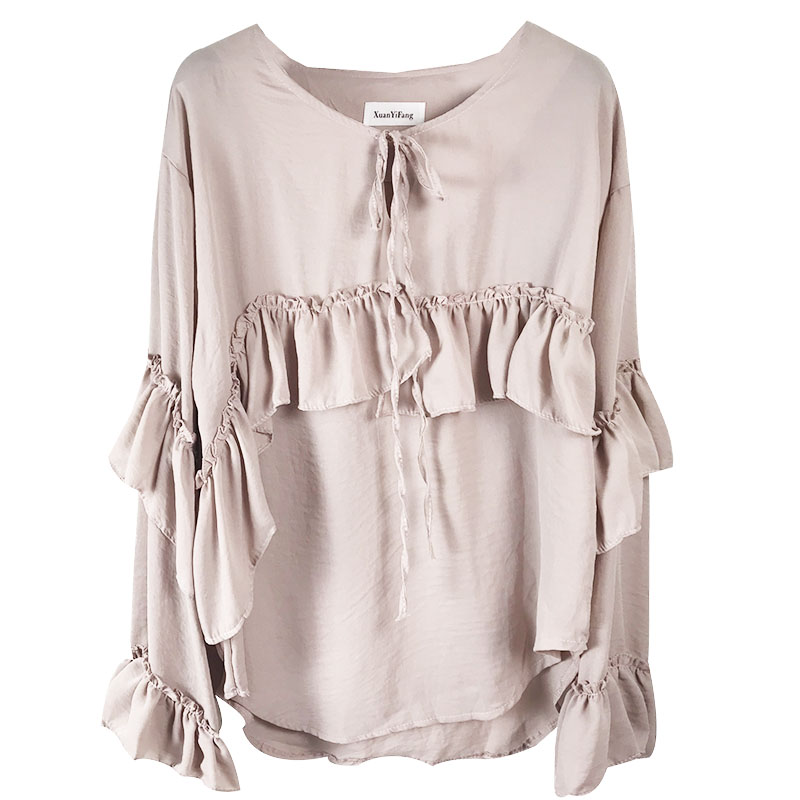秋裝女2018新款韓版氣質荷葉邊長袖雪紡襯衫時尚洋氣寬松系帶上衣
