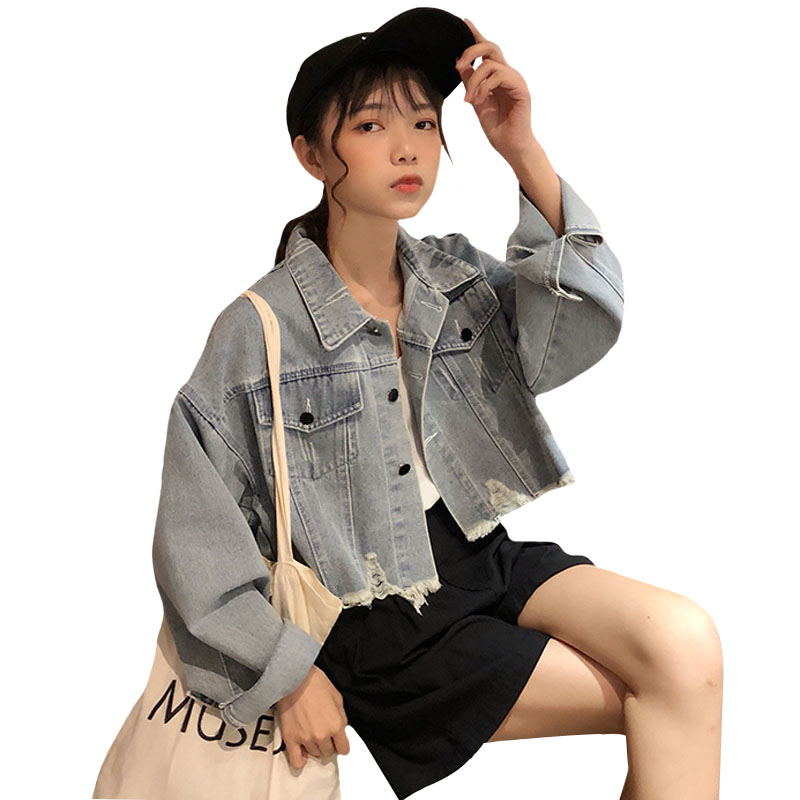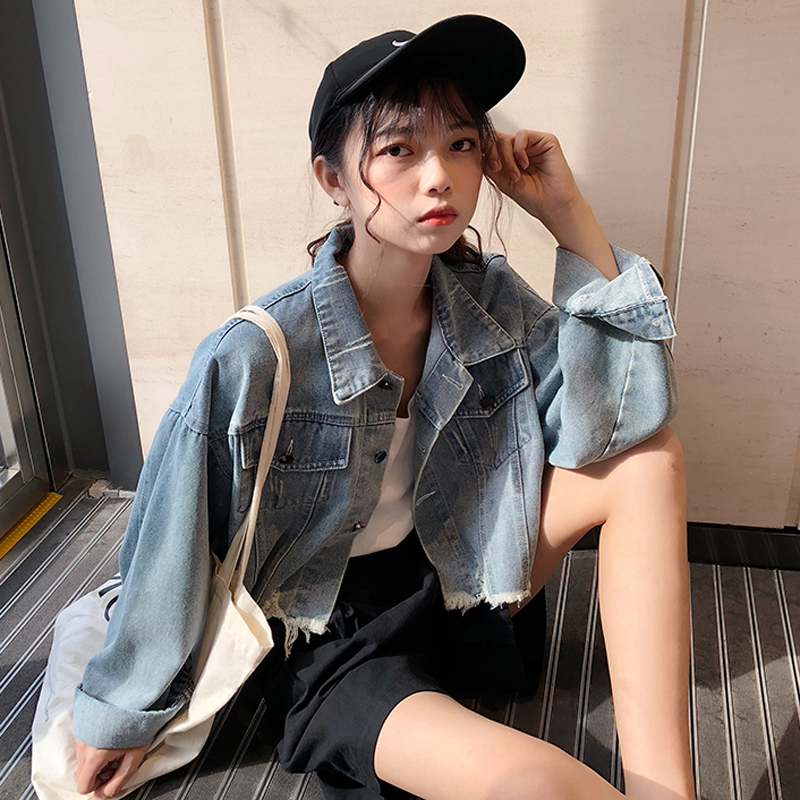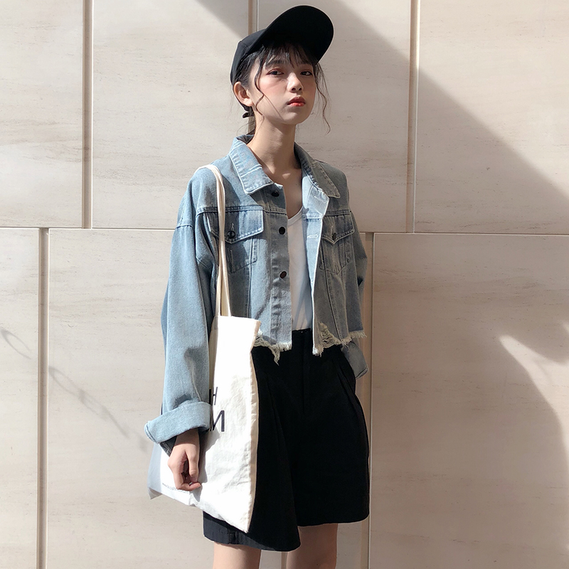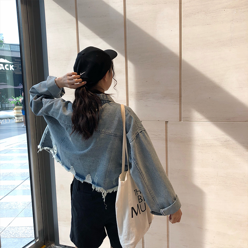 / 秋冬女裝韓版水洗做舊短款牛仔夾克寬松長袖破洞毛邊開衫上衣外套
