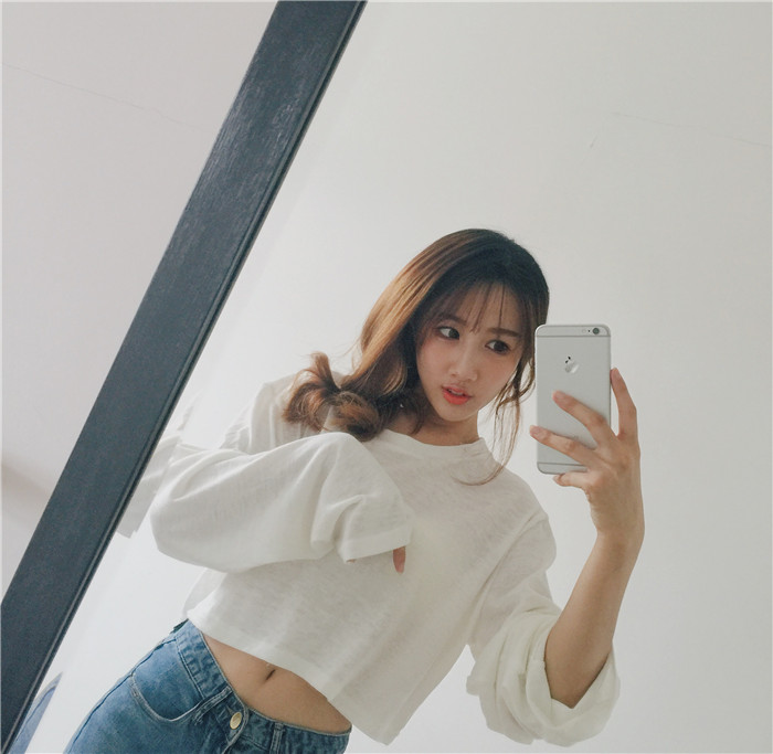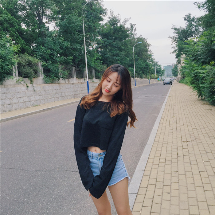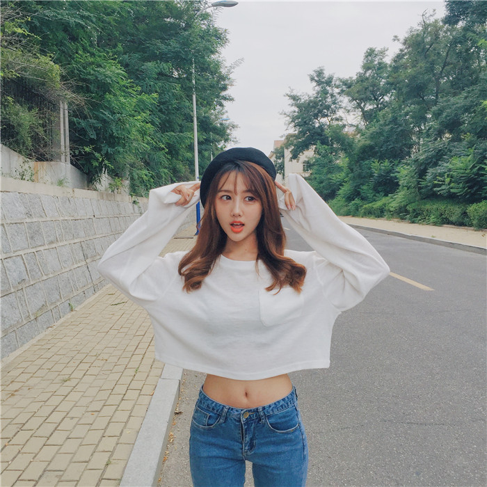 2018新款韓版女裝純色百搭寬松t恤女短款露肚臍白色長袖t恤上衣