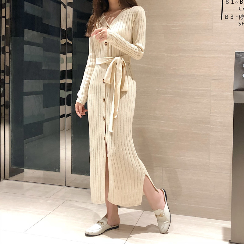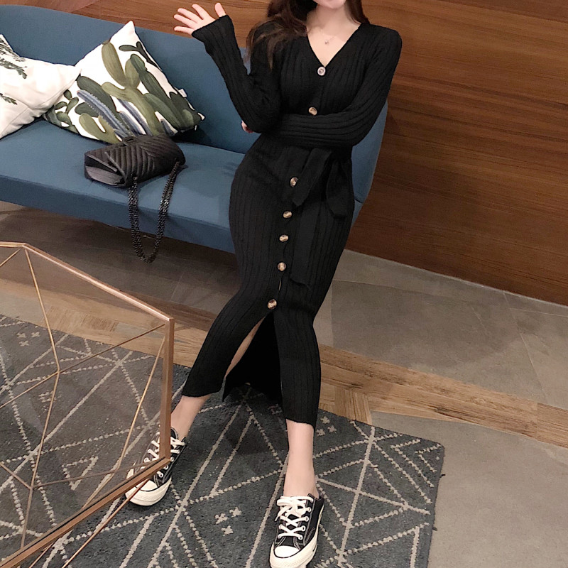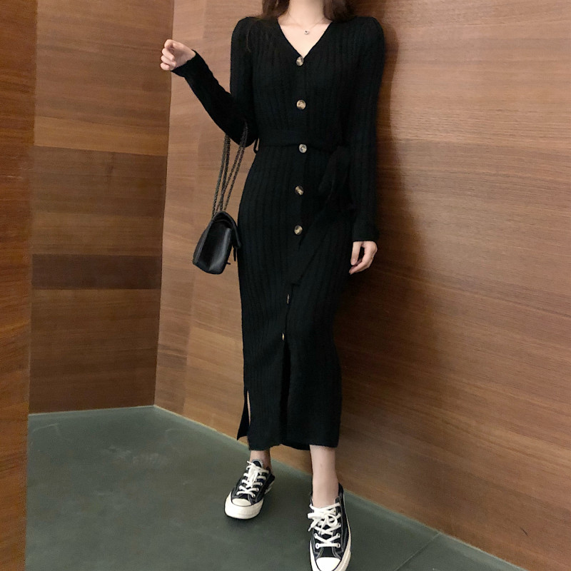 / 慵懶風長裙新款修身顯瘦港風復古裙子毛衣連衣裙長袖針織包臀裙女