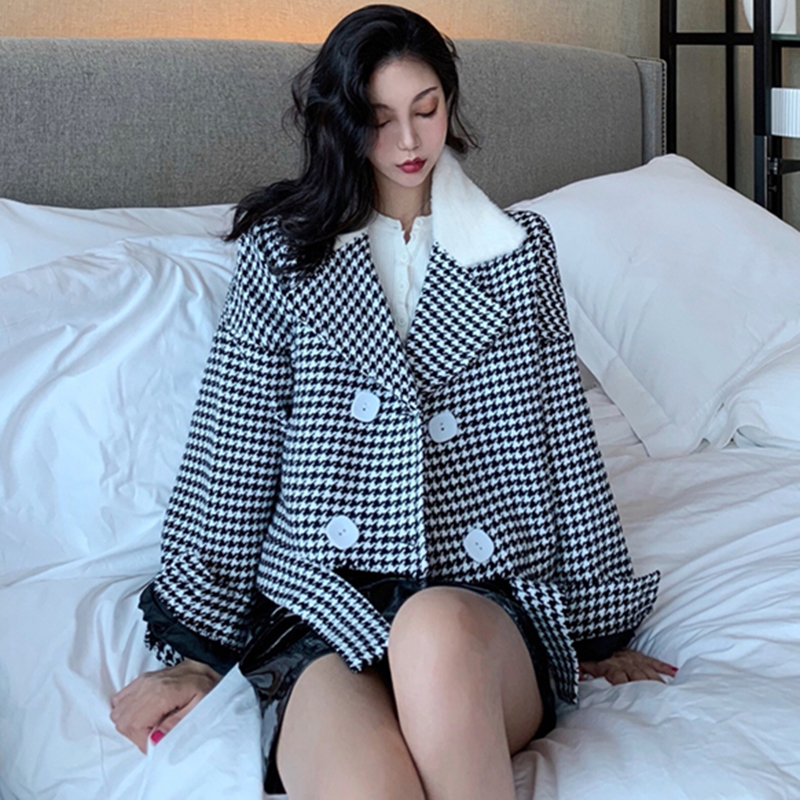 / 翻領格子毛呢短外套秋冬女裝2018新款港風學生寬松開衫休閑上衣潮